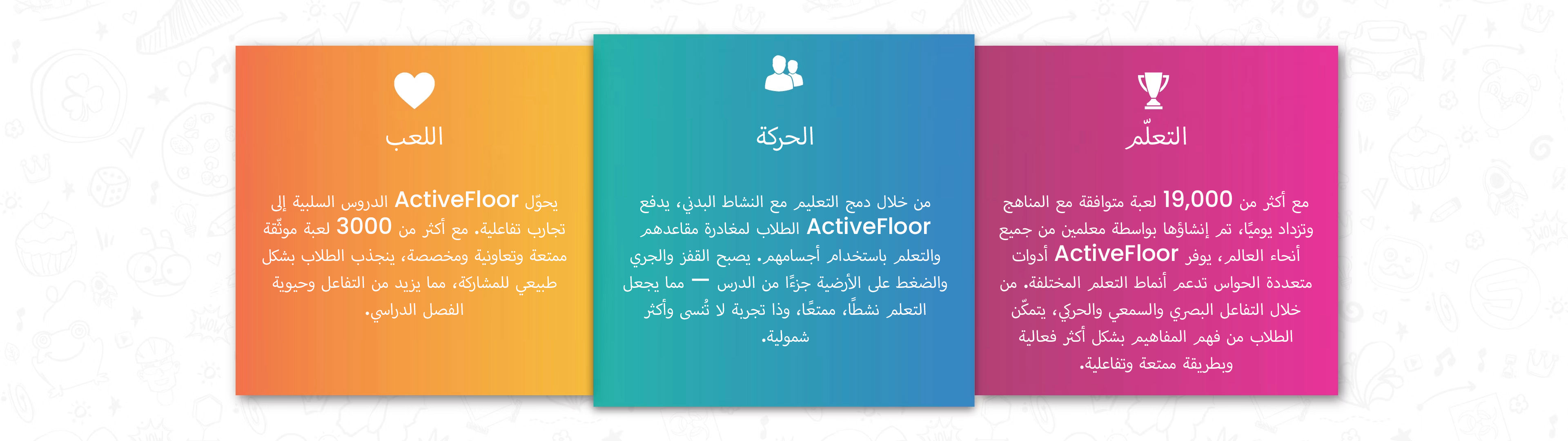 ActiveFloor هو حل تفاعلي للأرضية يجمع بين الحركة والتعلّم. يتحرك الطلاب فعليًا على الأرض ويتفاعلون مع أنشطة التعلم والألعاب والمهام التي تحفّز كلًا من الجسم والعقل. مع ActiveFloor، يمكنك جعل المواد الدراسية المعقدة مثل الرياضيات واللغة والعلوم ممتعة وجذّابة؛ وكل ذلك يحدث من خلال اللعب والحركة!