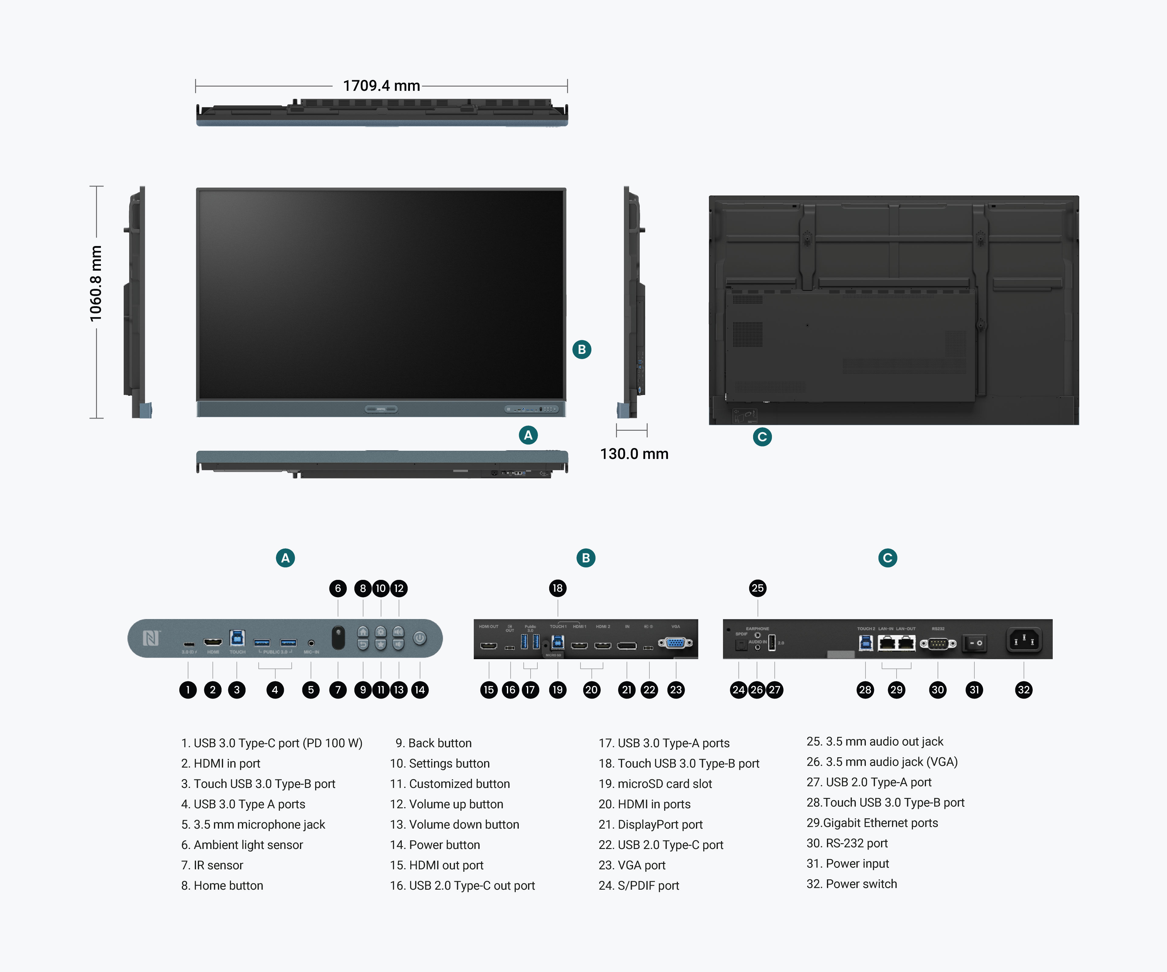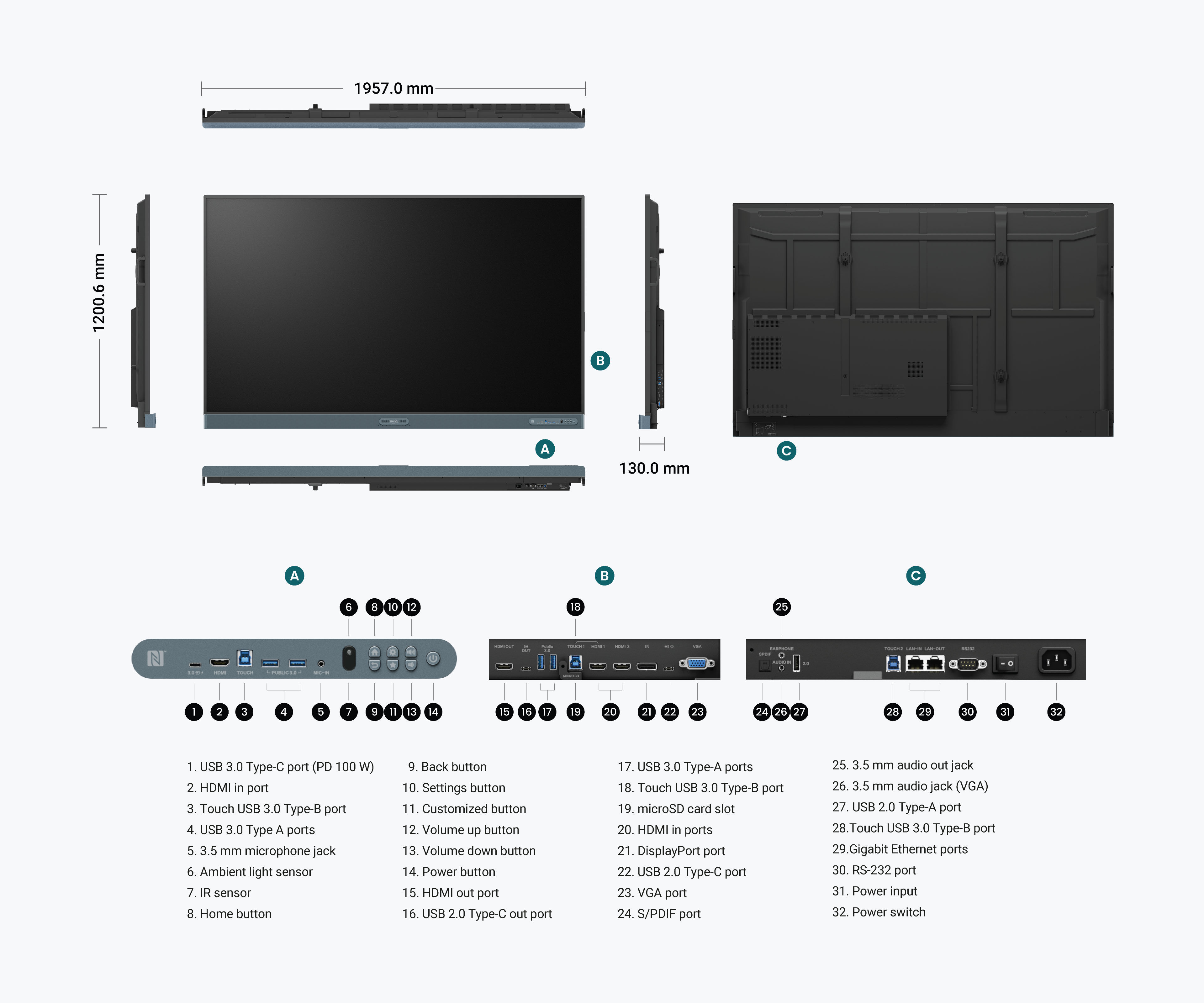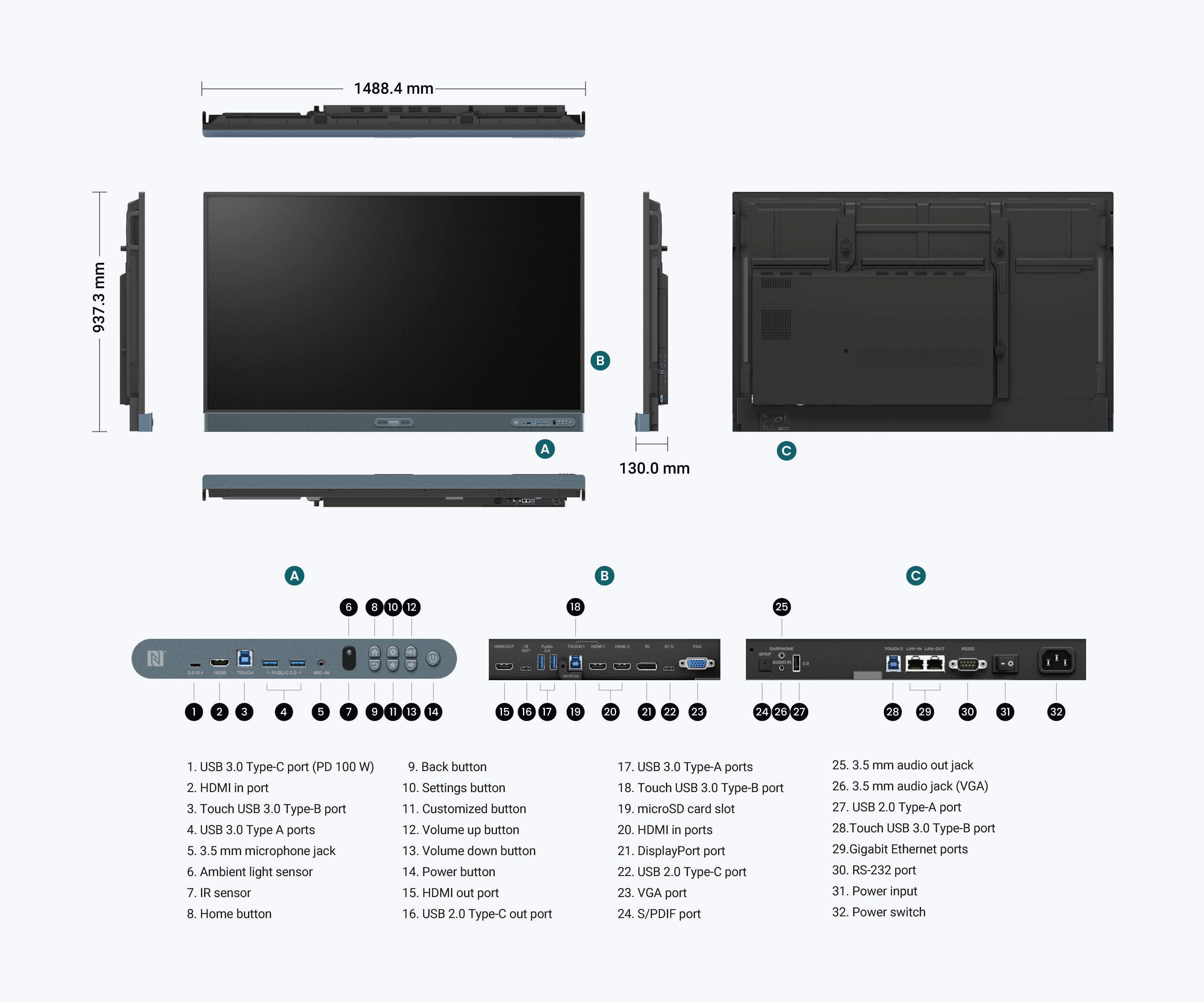 1 × HDMI (3 m | 9.8 ft), 1 × USB-B for touch (3 m | 9.8 ft), 1 × USB-C (1.5 m | 4.9 ft)