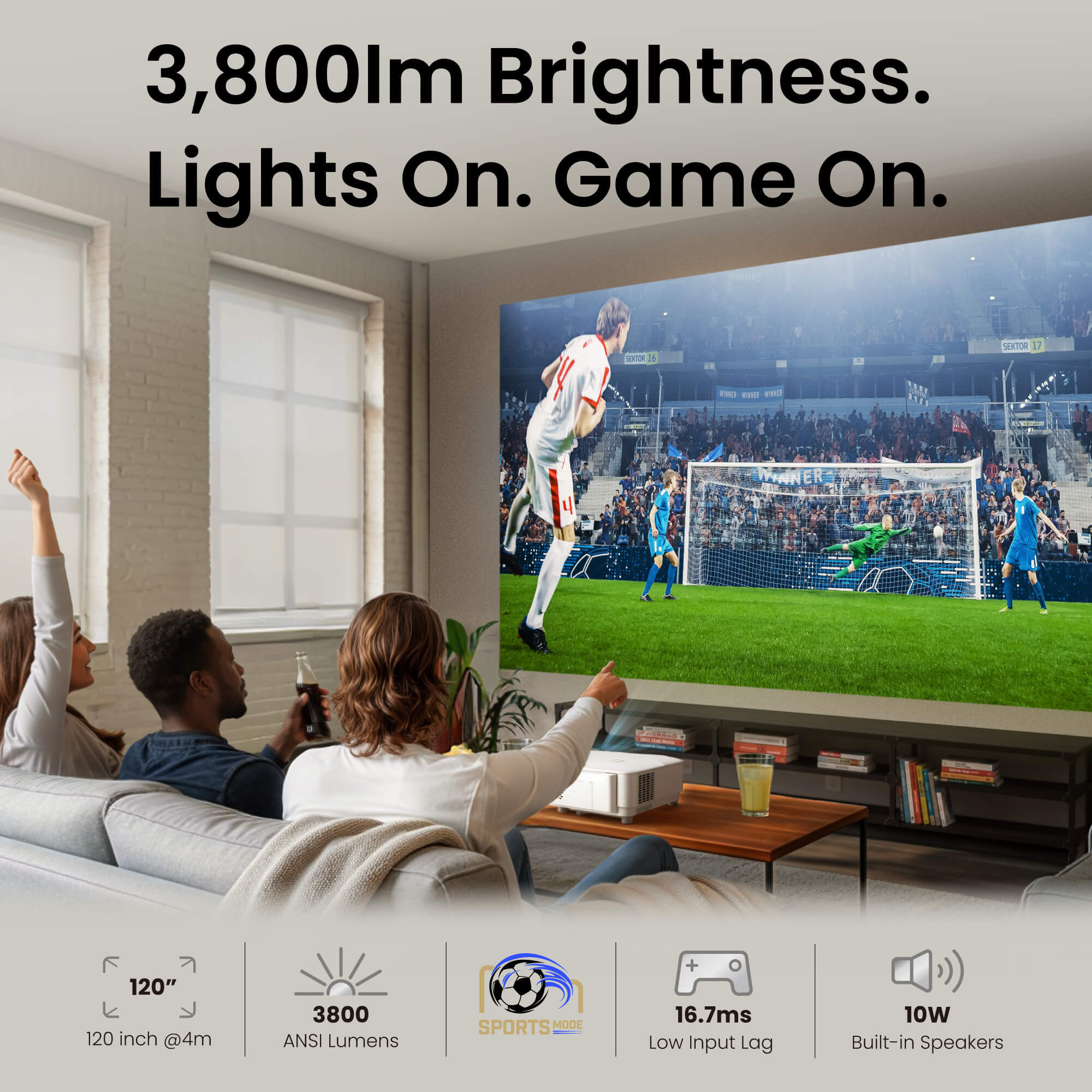 • 3,800lm high brightness for a vibrant 120" big-screen experience, even with the lights on.