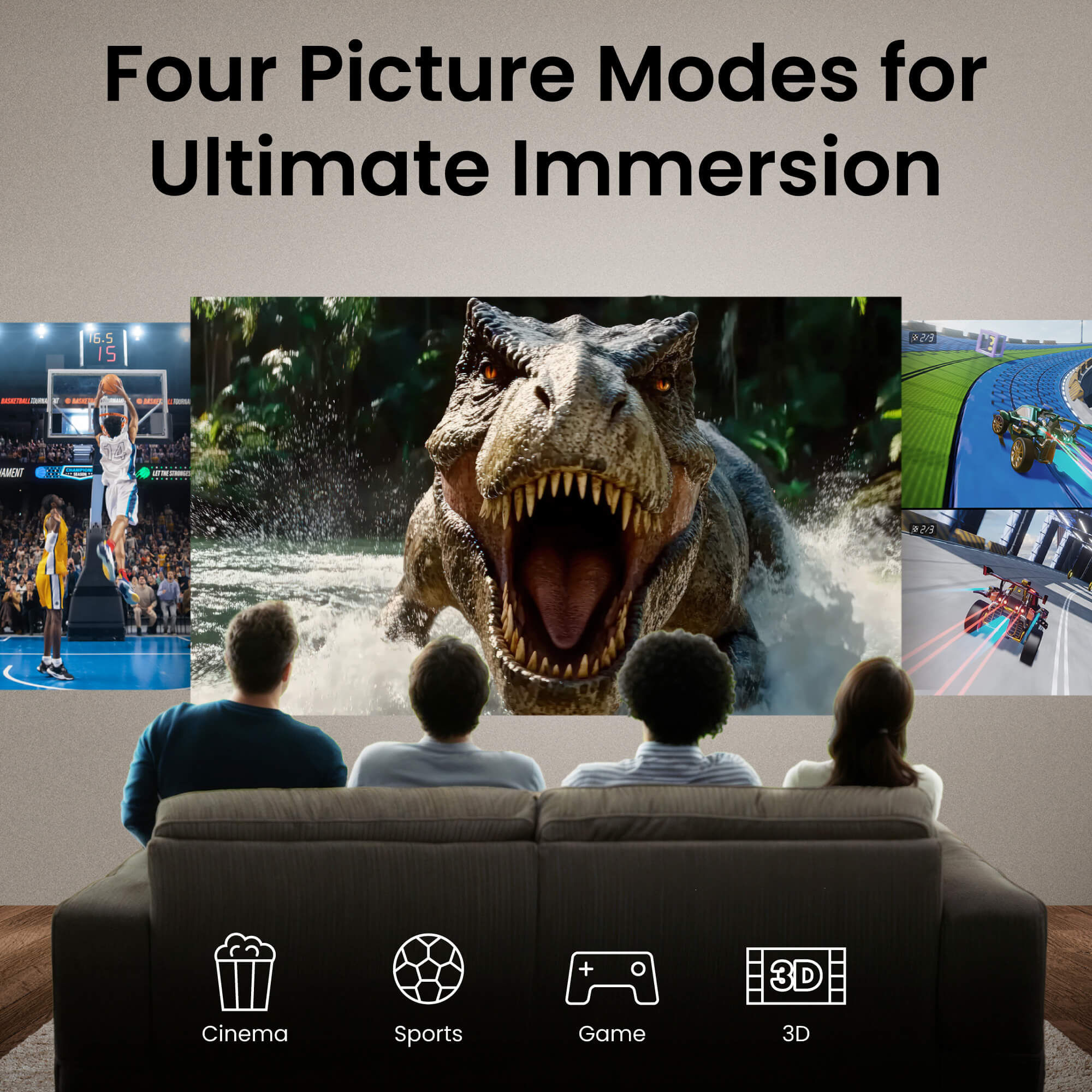 • Four optimized picture modes—Cinema, Sports, Game, and 3D—tailored for an immersive viewing experience in your living room.