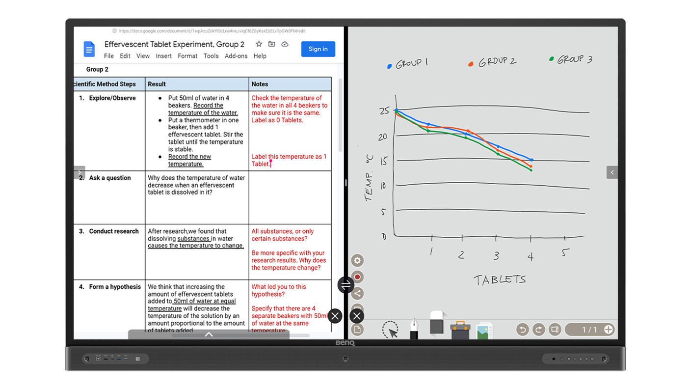 When the experiment data points start coming in from each group, they can be compared in real time on the display. With the Duo Windows split-screen mode on BenQ interactive displays, Google Docs can be opened on one side while data is plotted on the other using EZWrite. With EZWrite 6, sessions can be saved as IWB files, enabling you to pick up the lesson at any time right where you left off.