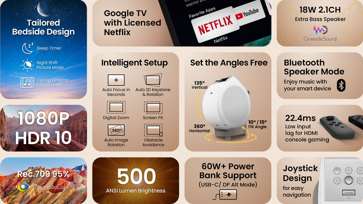 GV32’s flexible base design, similar to an integrated tripod, is tailor-made for bedside ceiling projection, offering you freedom to project from any desired angle while relaxing in the comfort of your bed.