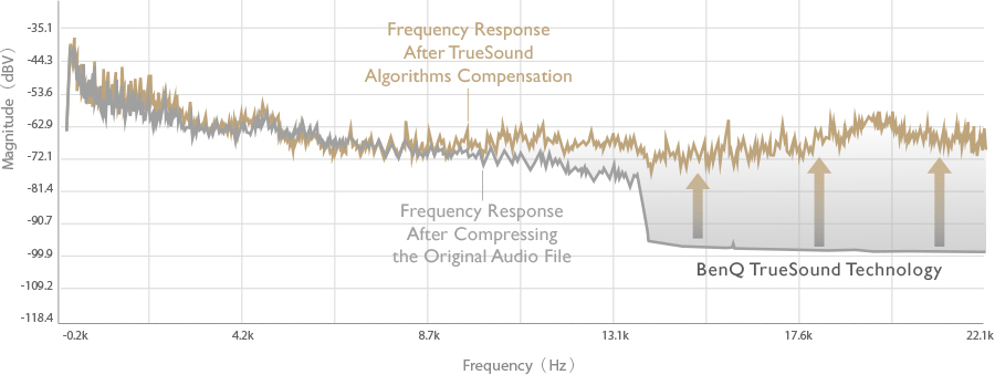 treVolo 2 speaker features a unique technology called TrueSound, that can help improve sound quality on highly compressed legacy audio files. If the speaker's DSP chip detects the loss of higher frequency data due to a low bit rate recording or high compression levels, TrueSound will improve the detail in the higher ranges of the audio spectrum.