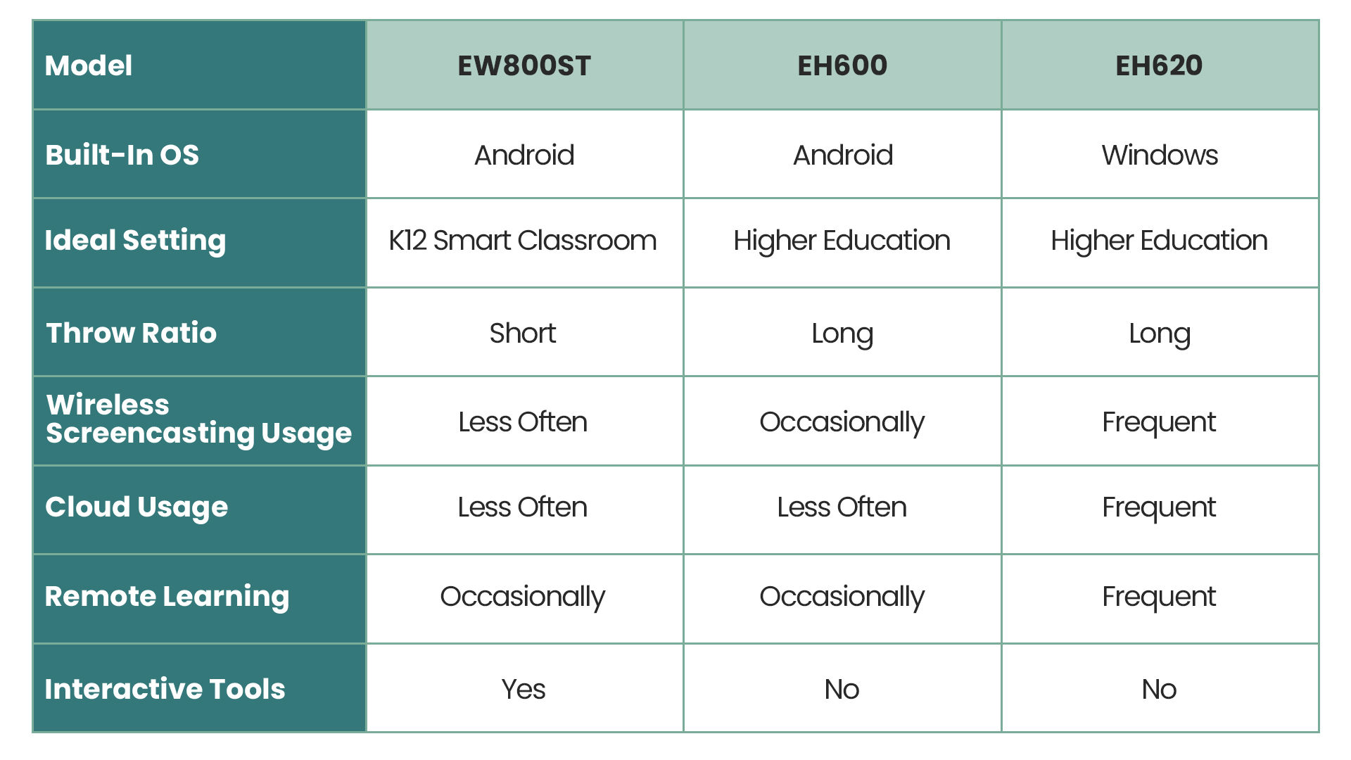 Thus, the specific needs for such classrooms are the following: a short throw-ratio to project a large screen, basic wireless projection, and support for interactive peripherals. Based on these needs, the ideal Smart Projector candidate for K12 classrooms is the EW800ST.