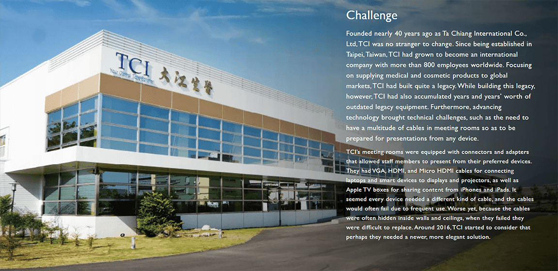 TCI was impressed by InstaShow’s ease-of-use and by how it streamlines the process of switching between presenters. TCI is continuing to install InstaShow units in meeting spaces as needed and plans to deploy the system in its China offices in 2019.