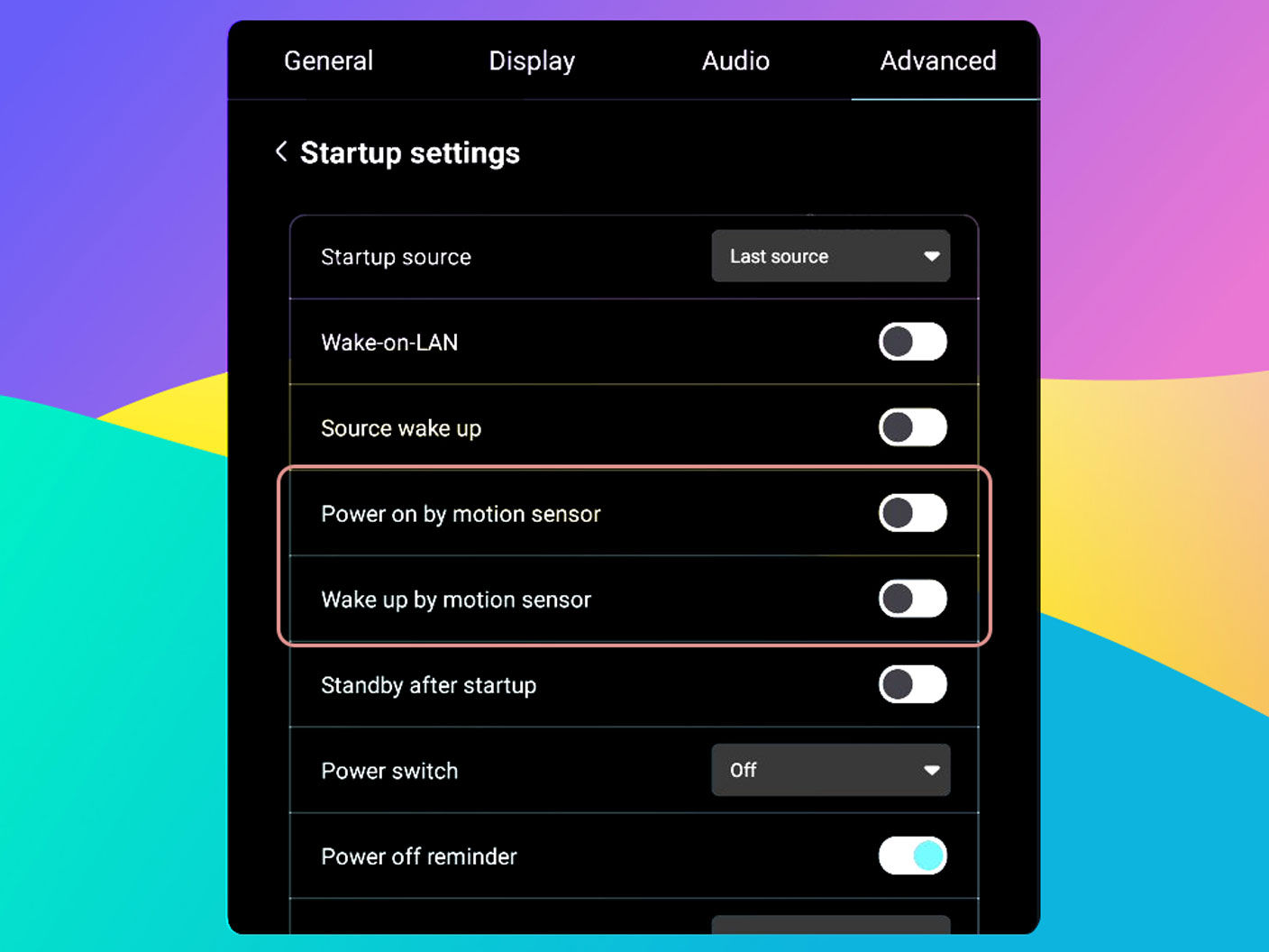 The motion sensor on Pro series models can be used to automatically power on or wake up the board if anyone approaches it. This can be handy but can also result in accidental powering on or waking up of the board if someone merely walks past it. By default, auto power on and wakeup are turned off but it’s best to be sure.