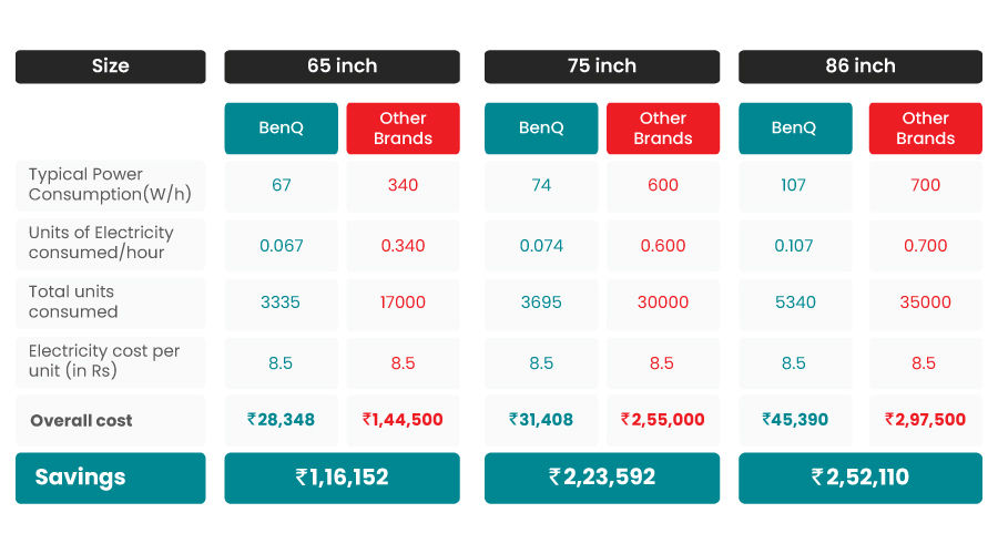Unlike traditional boards that consume over 300 Watts, BenQ boards run on as little as 67 watts/hour (65-inch model). That’s a huge drop in power usage — up to 70% lower than other brands. With the average unit rate of ₹8.5 per kWh, the savings add up fast: