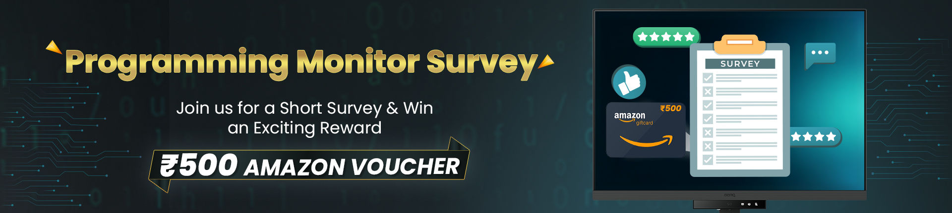 BenQ, a leading brand in monitors, is conducting research to better understand user experiences. We are currently seeking programmers who use external monitors at home and in the office to share their valuable insights. If you're interested in our research, we kindly invite you to fill out our questionnaire. The first 200 valid respondents will receive a ₹500 Amazon gift card. The survey will close once the quota is reached, so please complete it as soon as possible.