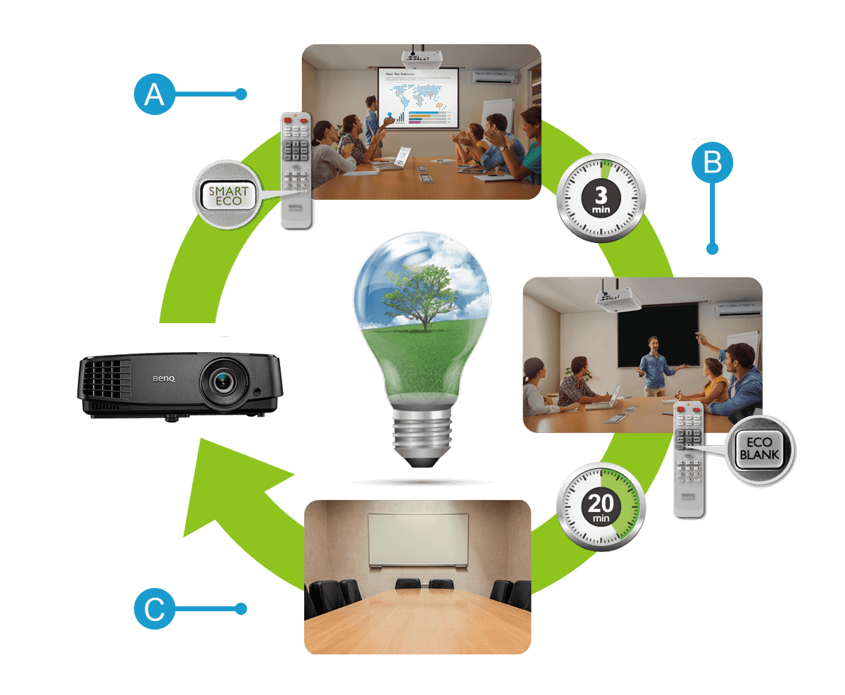 The BenQ Eco Cycle System eliminates electricity waste, reduces power-up wait time before and after meetings and minimizes maintenance for lower total cost of ownership.