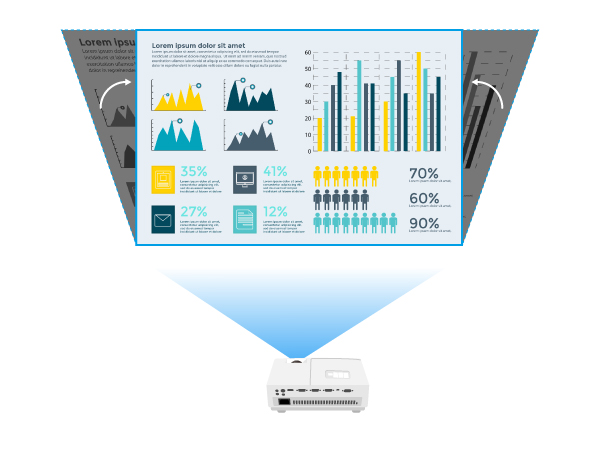Countering the trapezoid effect when the projector must be placed off-center, such as simple placement on top of a table, vertical keystone function adjusts the image for a professionally squared image. Keystone correction makes it easy to project ideally aligned images from a variety of locations.