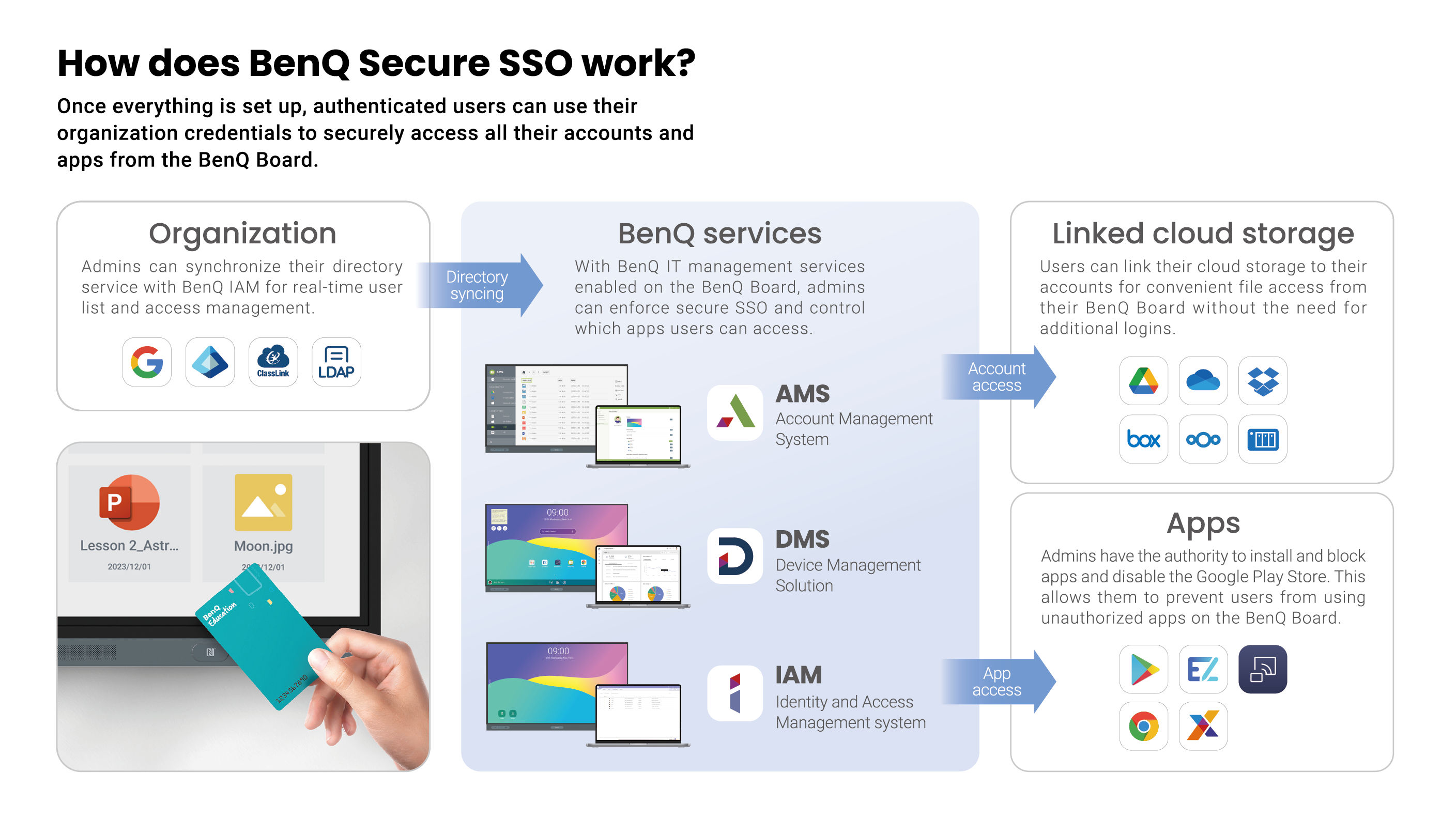 Aside from offering SSO free of charge, our BenQ IT management ecosystem not only lets you implement secure SSO, it also gives you the power to manage all your BenQ devices from a single console. We also have a secure data-compliant integrated account management platform that gives your users multiple ways to personalize their accounts and workspaces on their BenQ Boards.