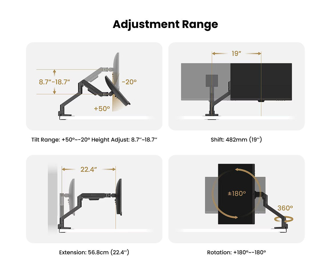 Height adjustment range: 8.7 inches to 18.7 inches (221 mm to 474 mm).