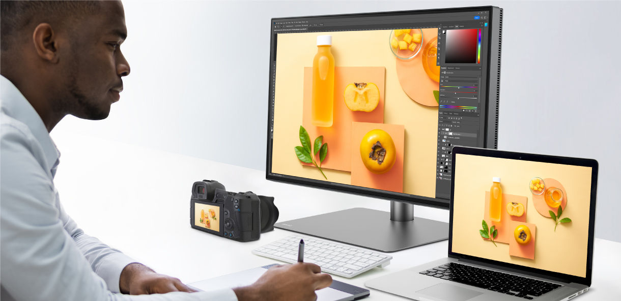 For designers who often need to zoom in on images to confirm edited details, it’s important to be able to quickly adjust the height and angle of the monitor and switch viewing between portrait and landscape. When you need to view and discuss a photo with several people or use it with a MacBook or iMac device, a design that facilitates quick height and angle adjustments helps you find an optimal viewing angle almost instantly. Switching the view between portrait and landscape allows you to quickly choose the best orientation for working on a project.