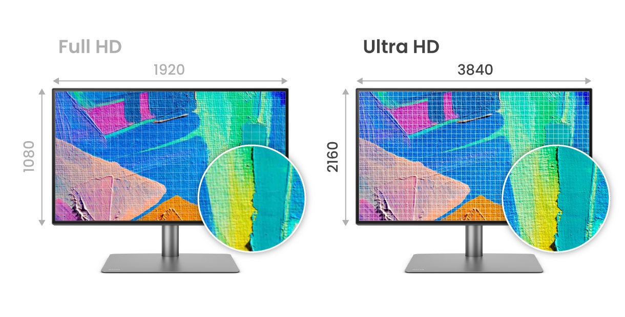 Resolution is another spec that photographers and designers sometimes misjudge or don’t pay enough attention to when choosing a monitor. 4K, also called Ultra HD(UHD) or 2160p, is currently the highest of the most common resolutions for monitors and televisions. In practical terms, it is precisely 3840 pixels wide and 2160 pixels tall and gives you four times the pixel count of Full HD(FHD) or 1080p. In terms of resolution, usually more is better. Resolution refers to the number of pixels that a monitor can display. All images, pictures, and text we see on the screen are made up of pixels. For a monitor of a given size, the higher the resolution, the more pixels a screen has, and therefore the sharper the displayed image.