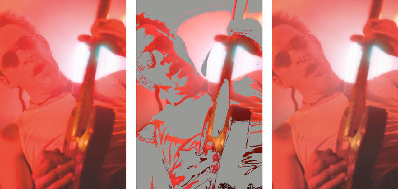 To further illustrate the RGB-CMYK issue, take a look at the guitar player photographs. The photograph on the left is a RGB image. The photograph on the far right is a CMYK simulation of the same shot; as you are likely to be reading this on a screen it would be wrong to call it CMYK because it is being rendered by a RGB device, conversely if you are reading this in print the photograph on the left would be a simulation of RGB. In class I give delegates a moment to digest that concept, and ask questions before moving on, as it is a very important point.