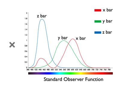 Humans tend to use ‘numbers’ to express an accurate measurement. For example, we use numbers to describe length, weight and etc. Therefore, we need a way to express colors in numeric forms, so we could say color A and color B are the same because they have the same numeric values. Back in 1913, CIE (Commission Internationale de l´Eclairage) defined Tristimulus Values (XYZ values) for quantifying the colors humans can perceive. The XYZ values are constructed by multiplying the following three attributes: the spectral power distribution of the light source, the reflectance of the object, and the Standard Observer functions to describe the characteristics of the human visual system. As a result, when color A and color B have the same XYZ values, we could say color A and color B look the same.