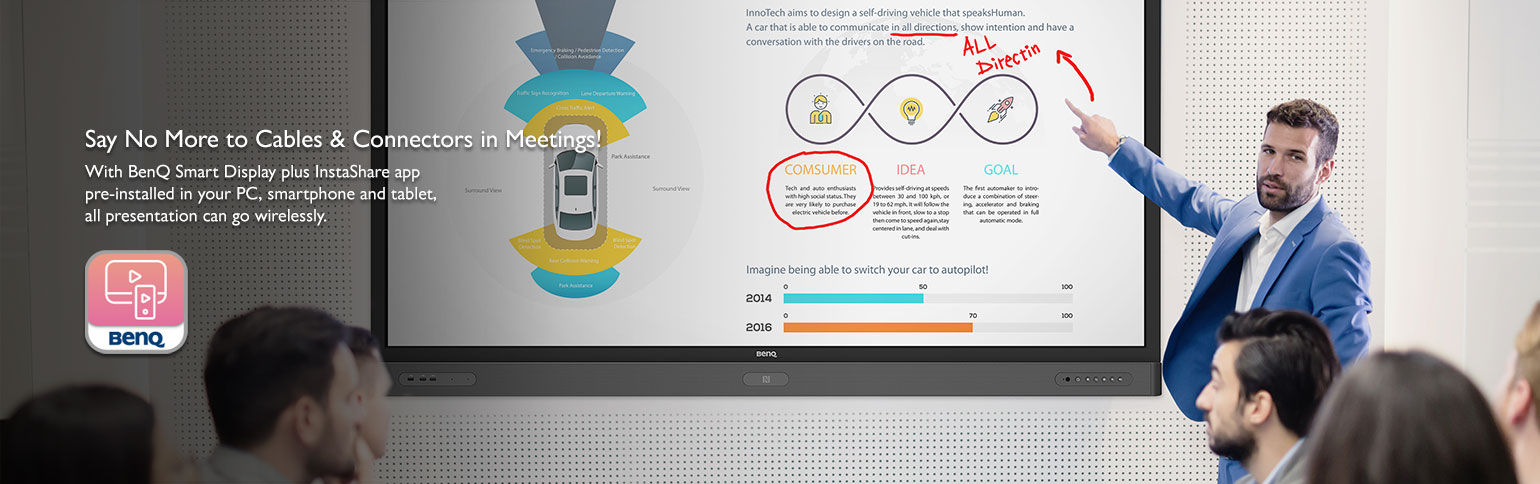 Communication goes both ways. With just one simple installation of the InstaShare app, it enables simple wireless presentation and collaboration by screen mirroring photos, presentations, and Full HD videos to BenQ ST series Smart Signage. It's easy to share to other devices, so that everyone in the meeting can also take a closer look of the content with their own devices.