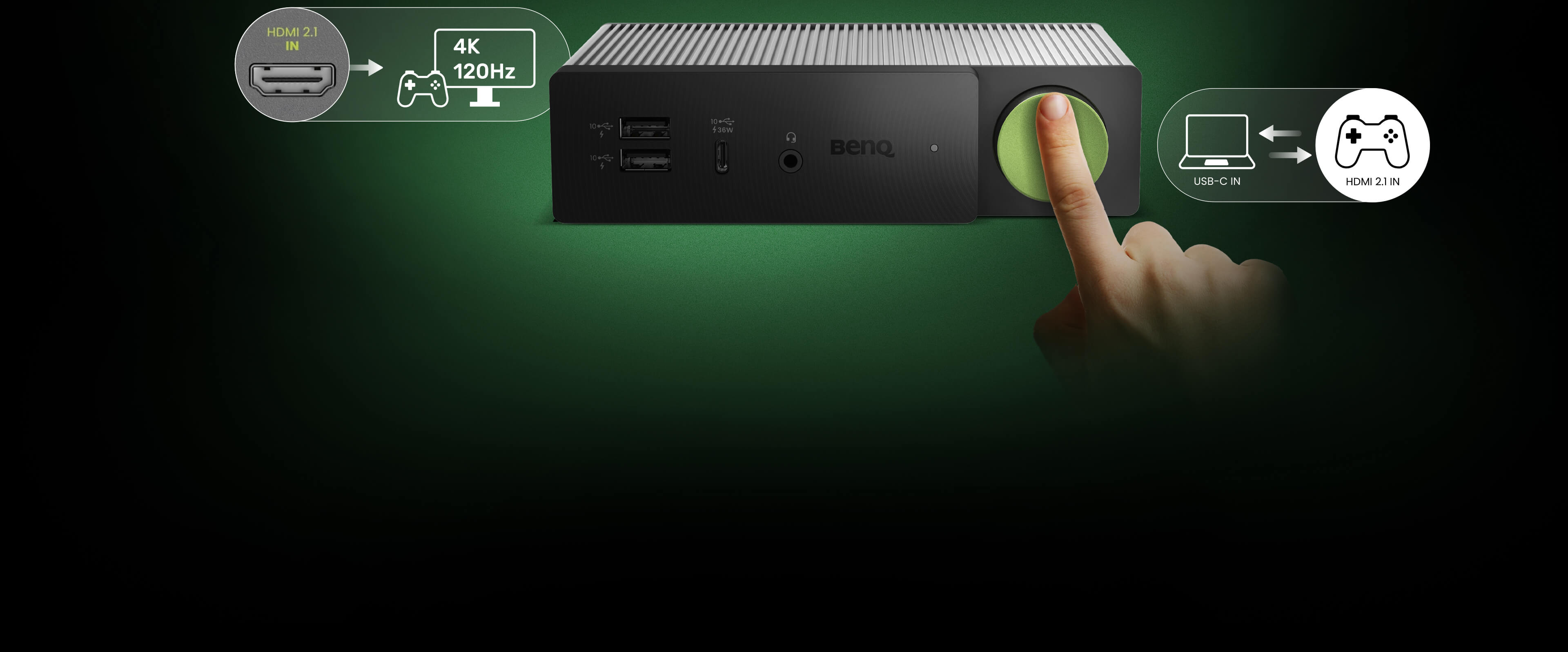 One click switches from USB-C for work to HDMI 2.1 for gaming, enhancing play with superior visuals.