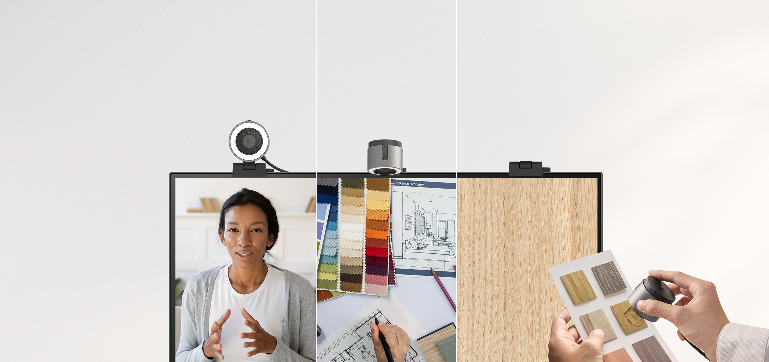 ideaCam mounts seamlessly on various monitors, including BenQ monitors and curved models, with a thickness of 1~7.5cm