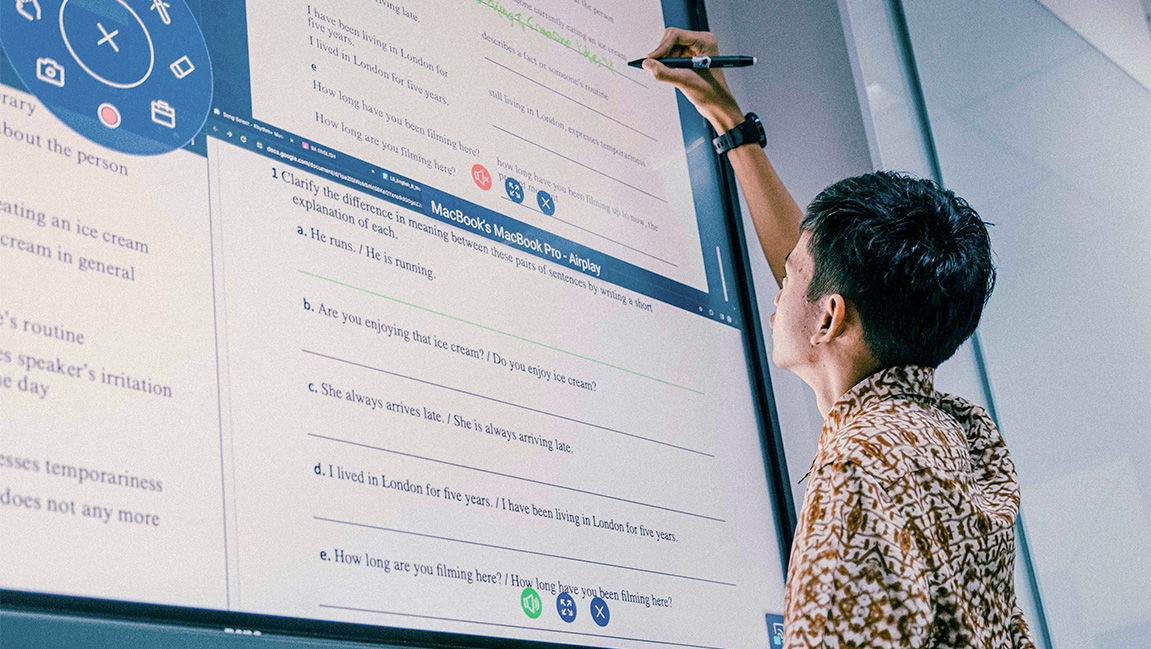 Global Prestasi School’s existing edtech, consisting of traditional projectors and whiteboards, hindered engaging lesson delivery. Additionally, they wanted a solution that would be intuitive for IT, including remote account and device management, as well as digital announcement functionality to send important messages to their classes.