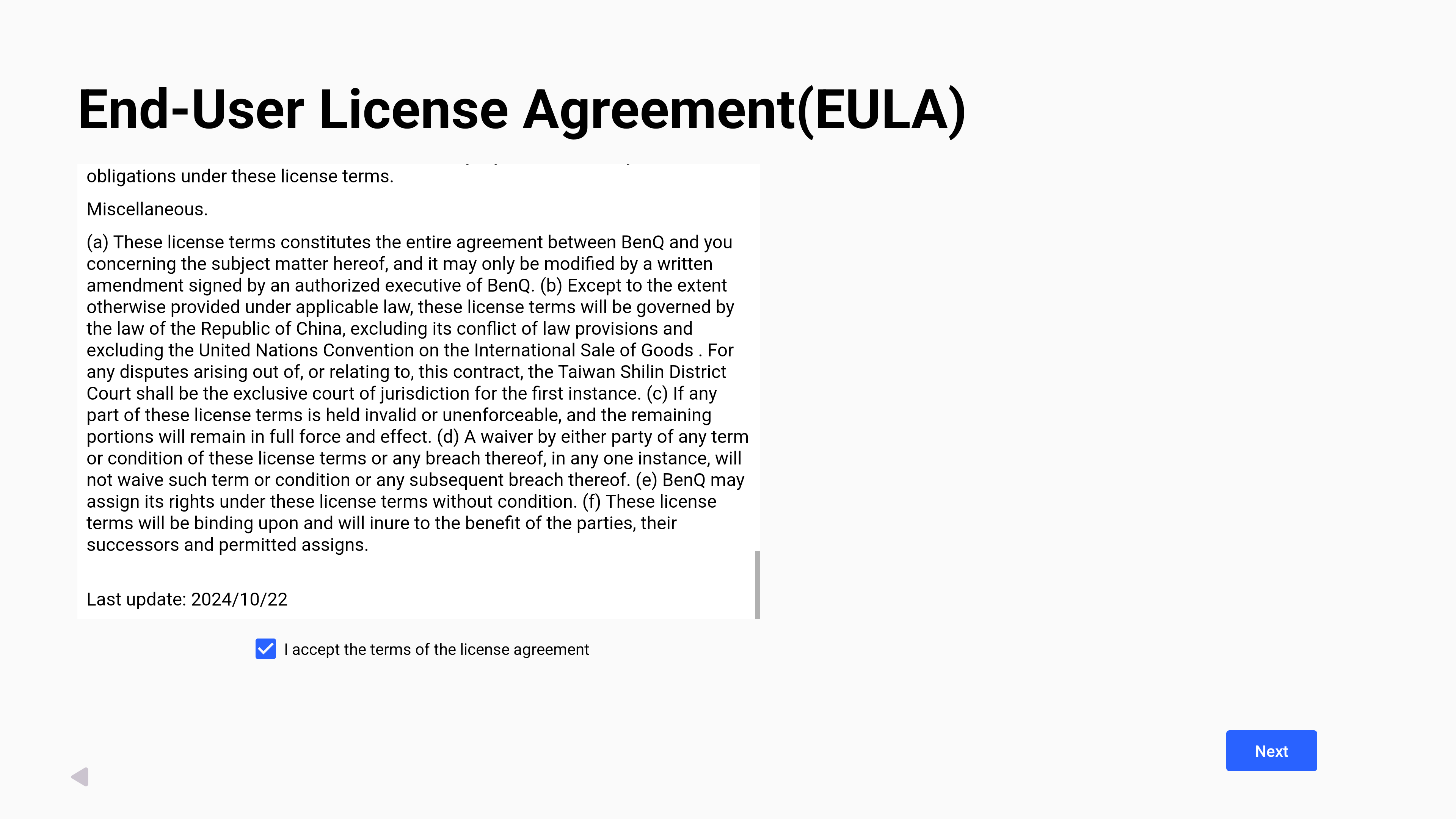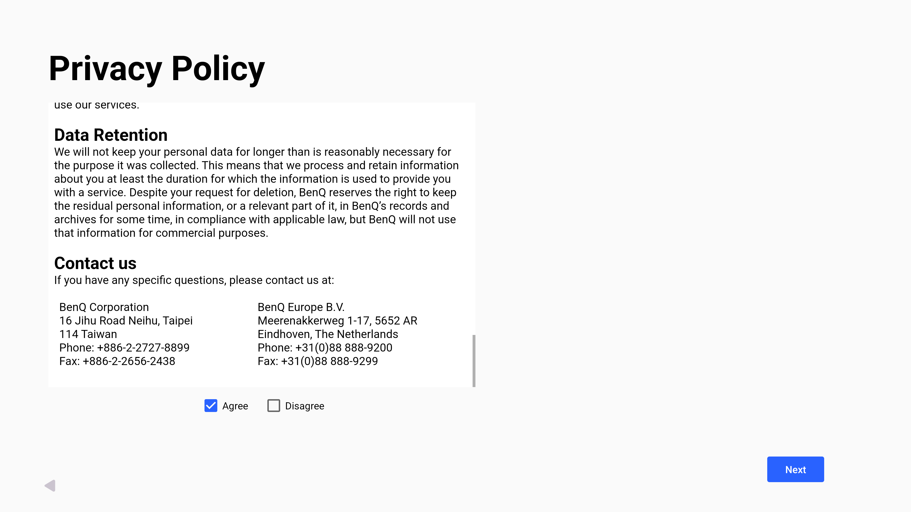 BenQ recommends enabling BenQ services, which grant IT administrators full access to display and user management features. Choosing to enable BenQ services at a later time will require you to reset the display to its factory settings and set up the BenQ Launcher.