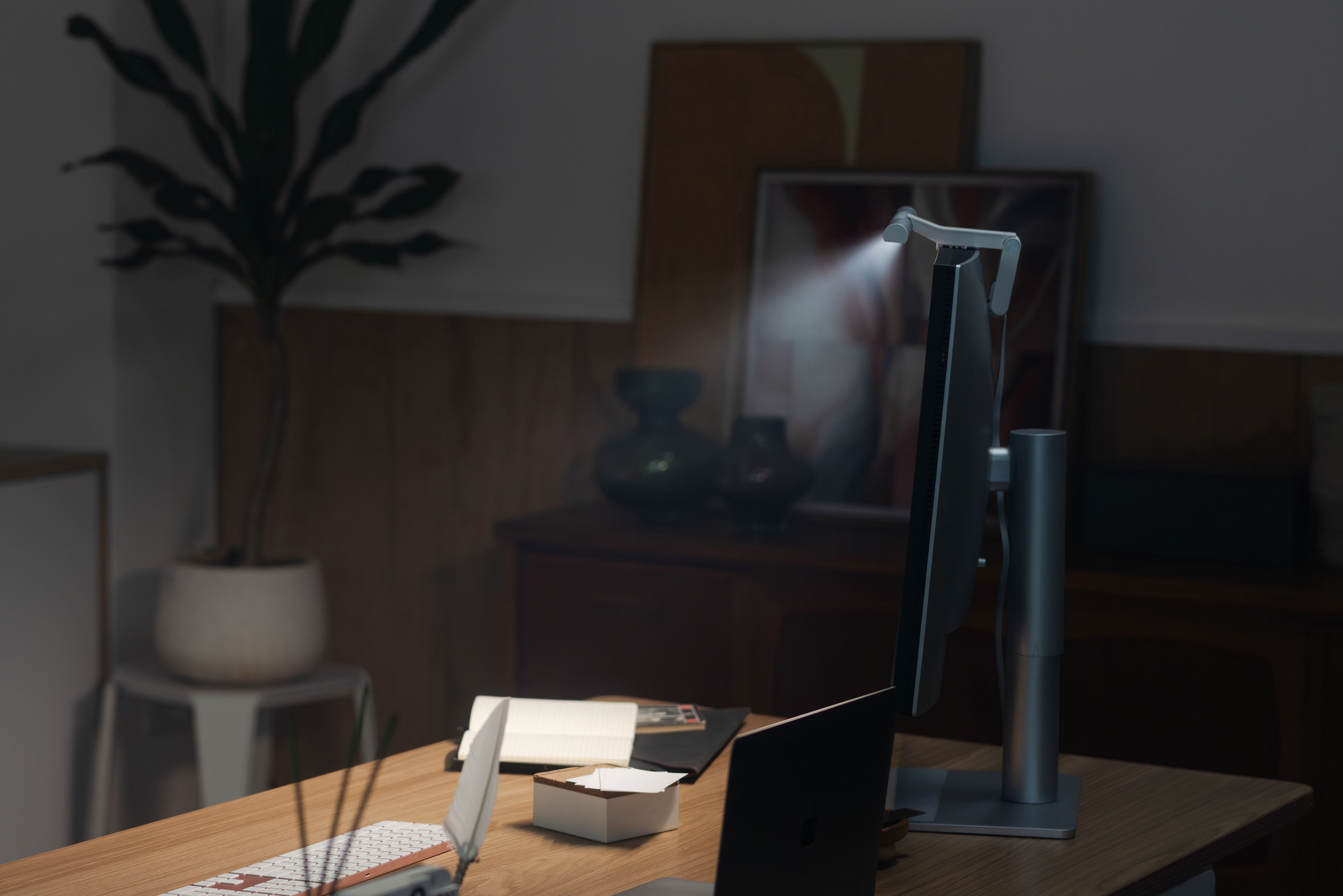 • Glare-free design: An asymmetrical design projects light forward and down, precisely illuminating the desktop area without reflecting off the display, thus preserving on-screen contrast.