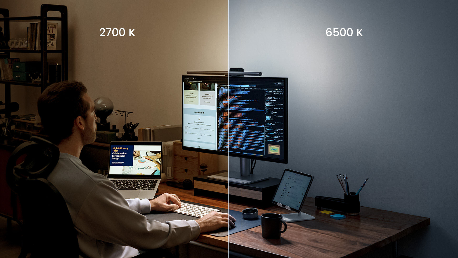 • Auto-dimming + color temperature control: Adapts brightness to your environment and lets you switch between warm (relaxed) and cool (high-focus) light.