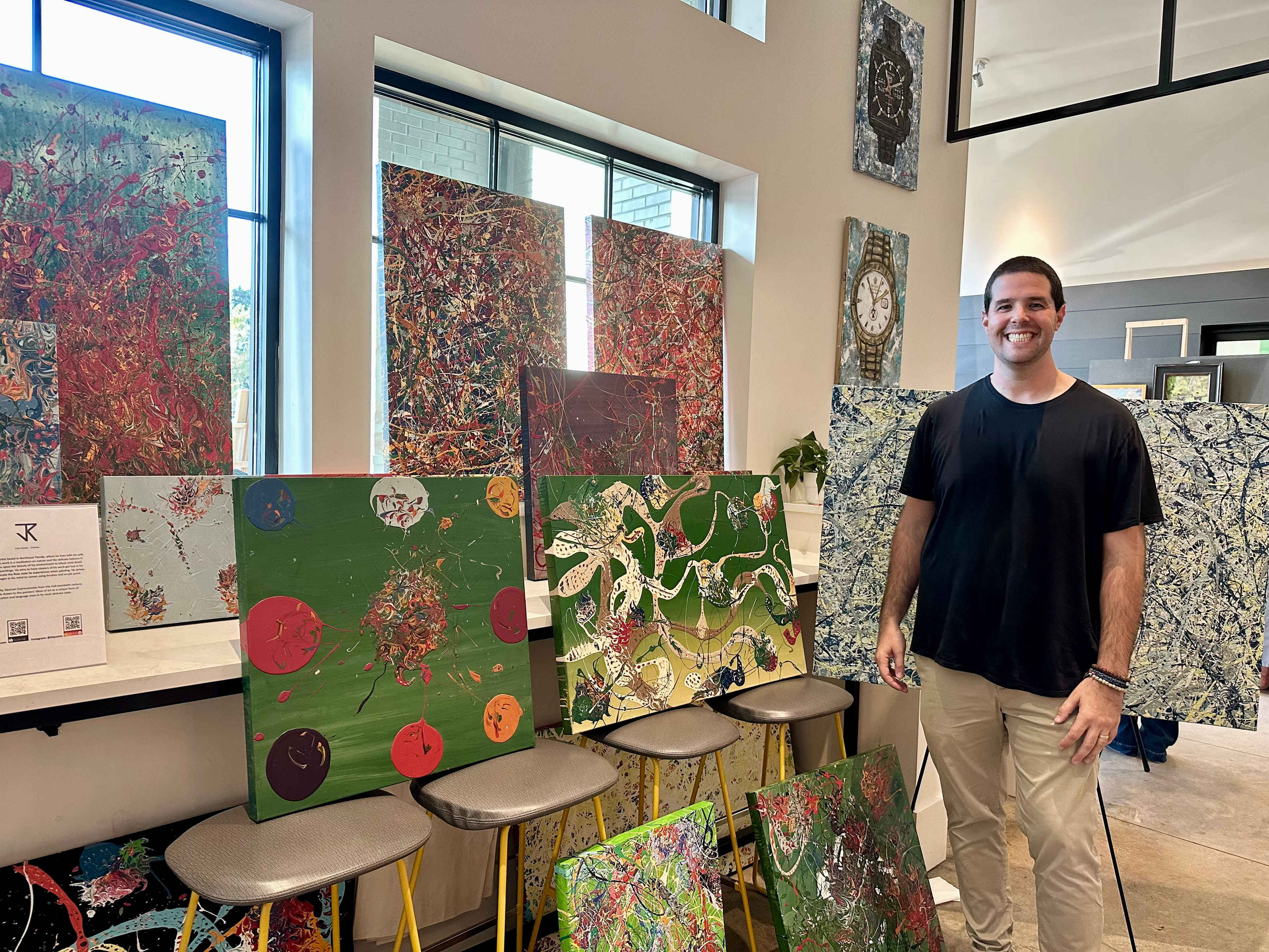John's journey into abstract art began at the age of 14, ignited by a transformative visit to MoMA in New York. Encountering the works of Pollock and Rothko in person inspired him to experiment with spray paint. This exploration led him to favor acrylics for their superior color balance. Influenced by Baroque and Impressionist masters, John delved into color theory, expanding his palette beyond the blues he was accustomed to. His inspiration is drawn from the vibrant colors and plant survival strategies in Florida's natural world, capturing his artistic sensibilities.