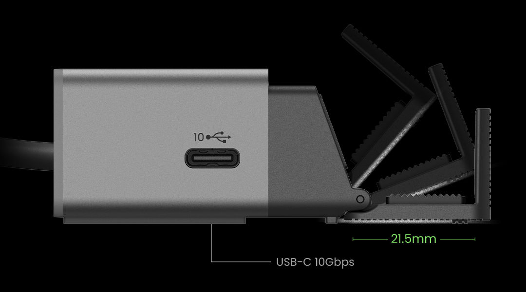 Portability is where the GR10 truly shines. Its flip stand allows you to dock devices like smartphones or iPad minis, projecting content to an external display via a single USB-C cable. Perfect for travel or remote work, the GR10 features a durable aluminum casing that ensures excellent heat dissipation during intensive high-speed data transfer and fast charging. The clever cable storage design prevents damage during transit, making it a reliable companion for professionals on the go.