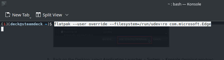 Before launching Xbox Cloud Gaming, a few additional configurations are necessary. First, you'll need to grant Edge the correct file access permissions. Open the Application Launcher again and search for Konsole (found under "System"). Open it and enter the following command: