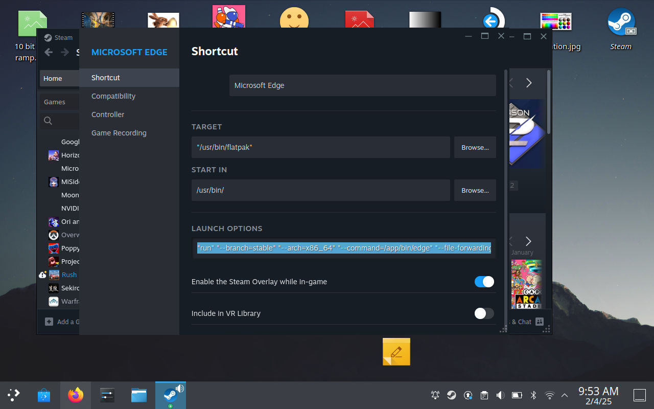 In Steam, locate Microsoft Edge in your Library, right-click it, and go to Properties. In the Launch Options field, append the following command after @@U @@: