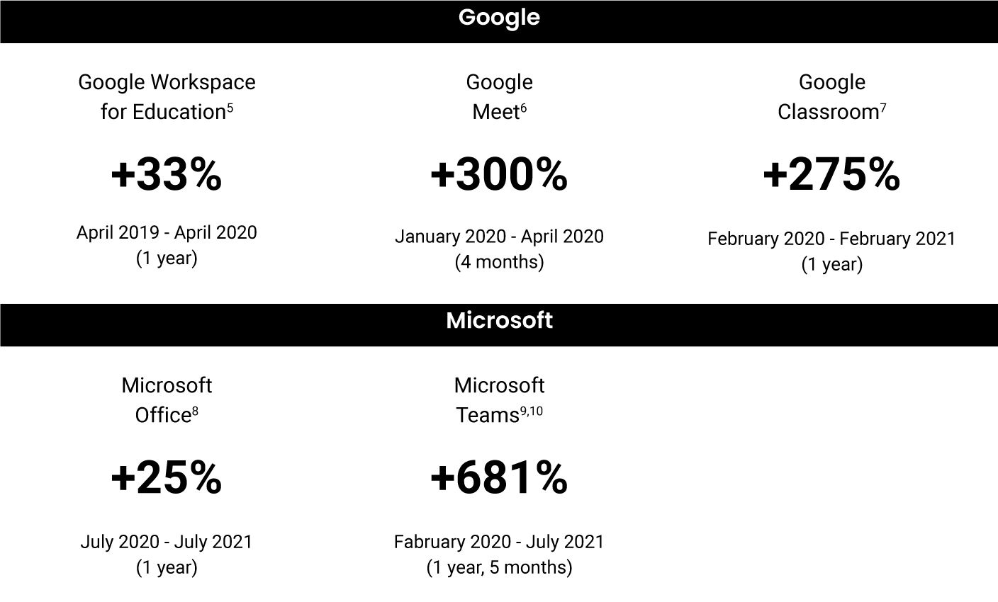 Los sistemas educativos de varios países ya han adoptado servicios en la nube para ampliar virtualmente sus aulas a los estudiantes remotos.3 Esta tendencia se refleja mejor en el incremento constante de usuarios activos de servicios en la nube en las escuelas. Zoom, por ejemplo, registró un aumento récord en su número de usuarios mensuales tras llevar sus servicios de videoconferencia empresarial al sector educativo.4 De manera similar, tanto Google como Microsoft notaron un crecimiento significativo en sus bases de usuarios activos diarios durante la pandemia.