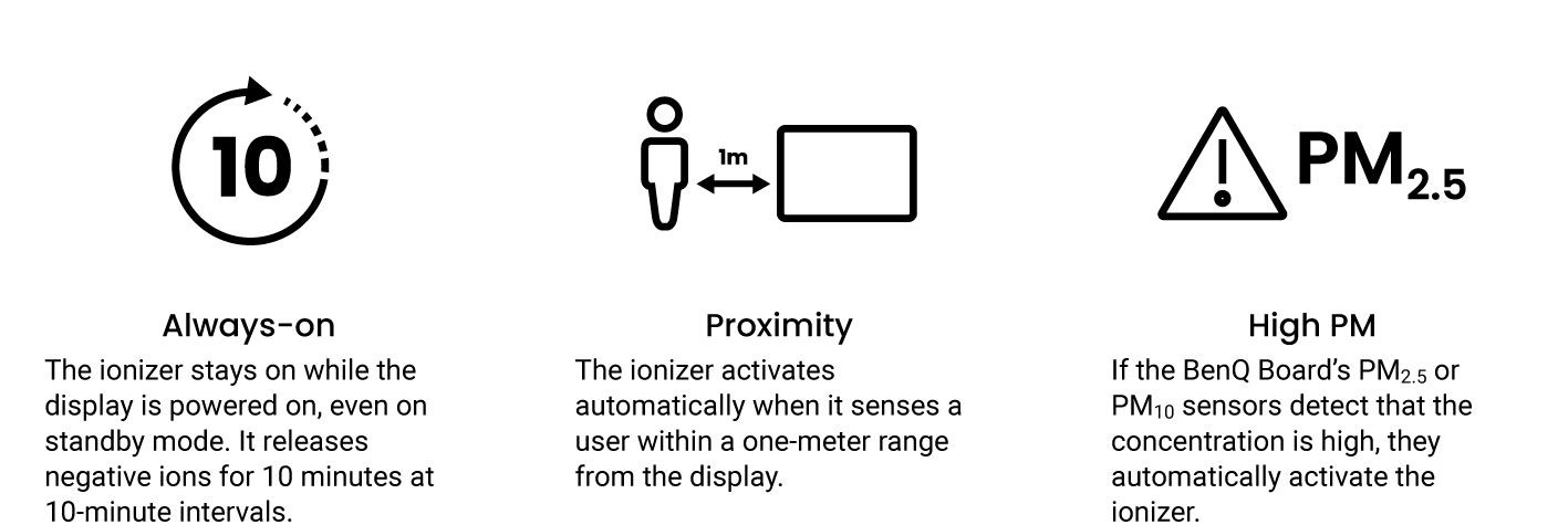 El ionizador integrado en la BenQ Board libera iones con carga negativa en el aire. Estos iones se adhieren a las partículas flotantes (PM2.5 y PM10), haciéndolas más pesadas hasta que caen y dejan de estar suspendidas en el aire. Este proceso de ionización ayuda a disminuir la cantidad de partículas inhalables en el área cercana.