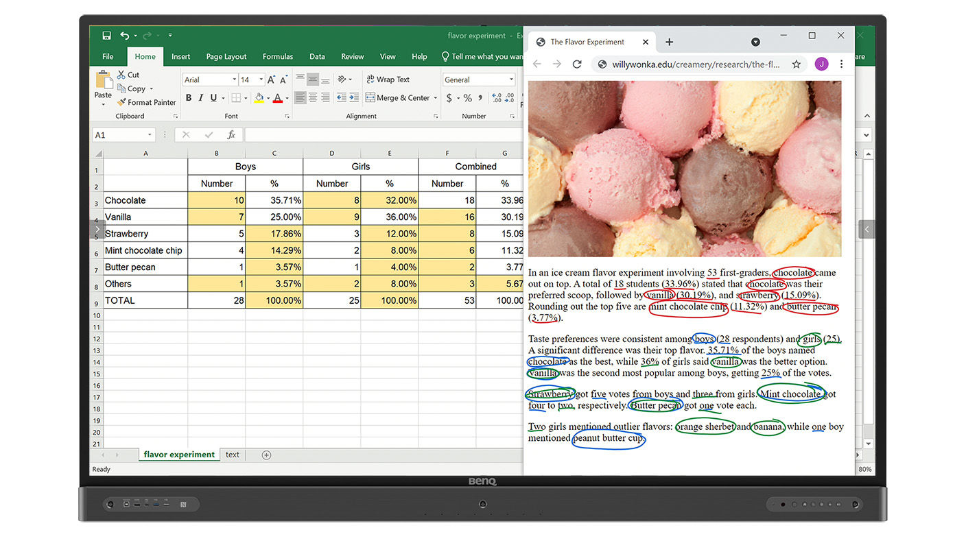 Puedes llenar una hoja con datos antes de presentarla en clase. Durante la lección, usa el modo Duo Windows de tu BenQ Board para dividir la pantalla. En un lado, muestra la hoja y en el otro, abre la pizarra en la nube EZWrite. Así puedes pedir a los estudiantes dibujar una gráfica en la pizarra basada en los datos proporcionados.
