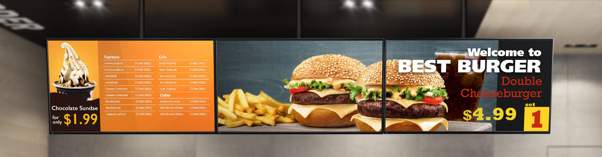 X-Sign permet de gérer facilement des murs d'écran. Grâce à ses modèles dédiés aux installations de type mur d'écran, X-Sign permet de créer et d’afficher du contenu, tels que des menus de restaurants, de manière simple et économique. En outre, X-Sign inclut une fonction de compensation de cadre qui calcule la largeur de celui-ci et l’écart entre les écrans LCD afin de réduire les effets de déformation et de donner aux images un rendu naturel.