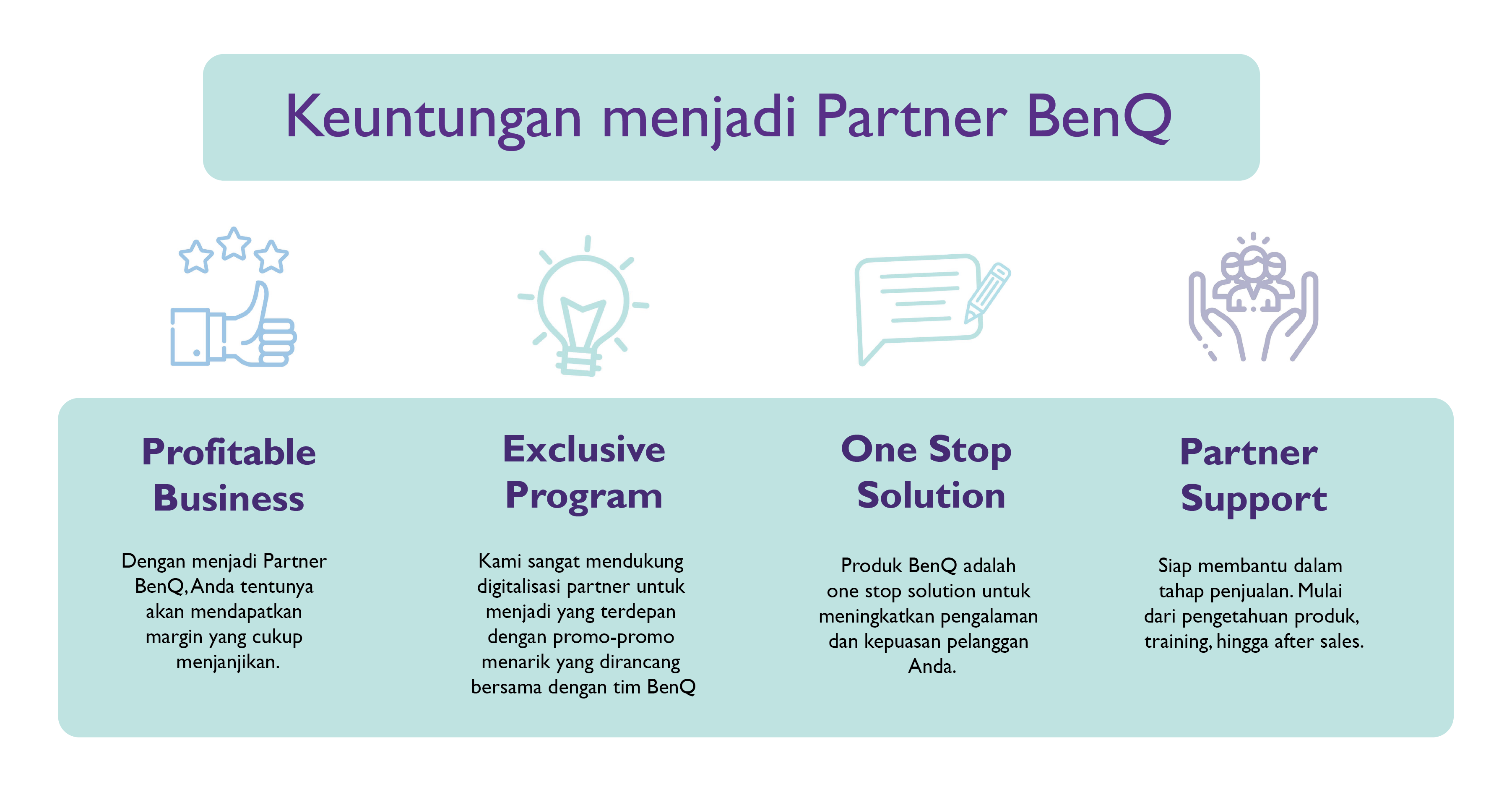 BenQ dari kata “Bringing Enjoyment ‘N’ Quality to Life” selalu berusaha inovasi untuk memberikan kenyamanan dan kualitas hidup bagi manusia. BenQ telah hadir di lebih dari 100 negara dan memiliki lebih dari 200 Partner di Indonesia.