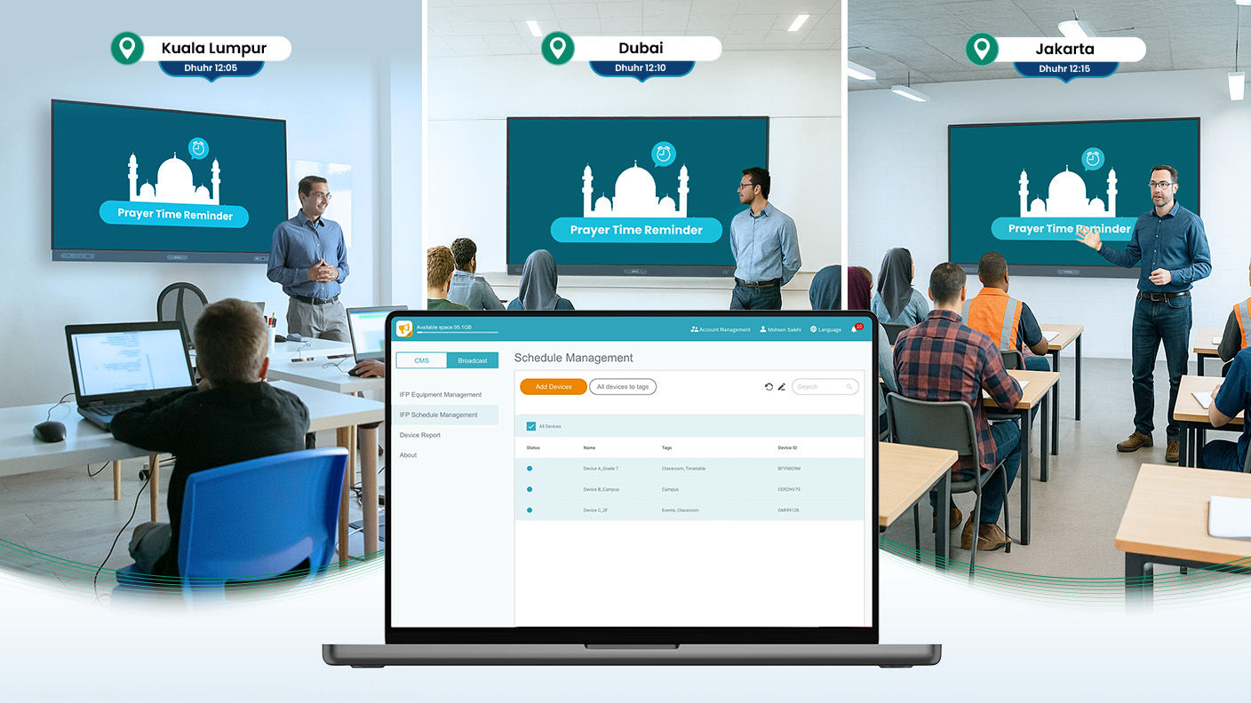 Di banyak wilayah mayoritas Muslim, waktu salat sangat penting dalam kehidupan sehari-hari. Namun, mengatur pengingat secara manual di banyak kelas bisa menjadi tantangan. Integrasi baru ini menyematkan pengingat harian langsung di X-Sign Broadcast, memungkinkan sekolah mengotomatisasi dan menyesuaikan notifikasi sesuai kebutuhan komunitas, sekaligus membuat operasional harian pendidik dan siswa lebih efisien.