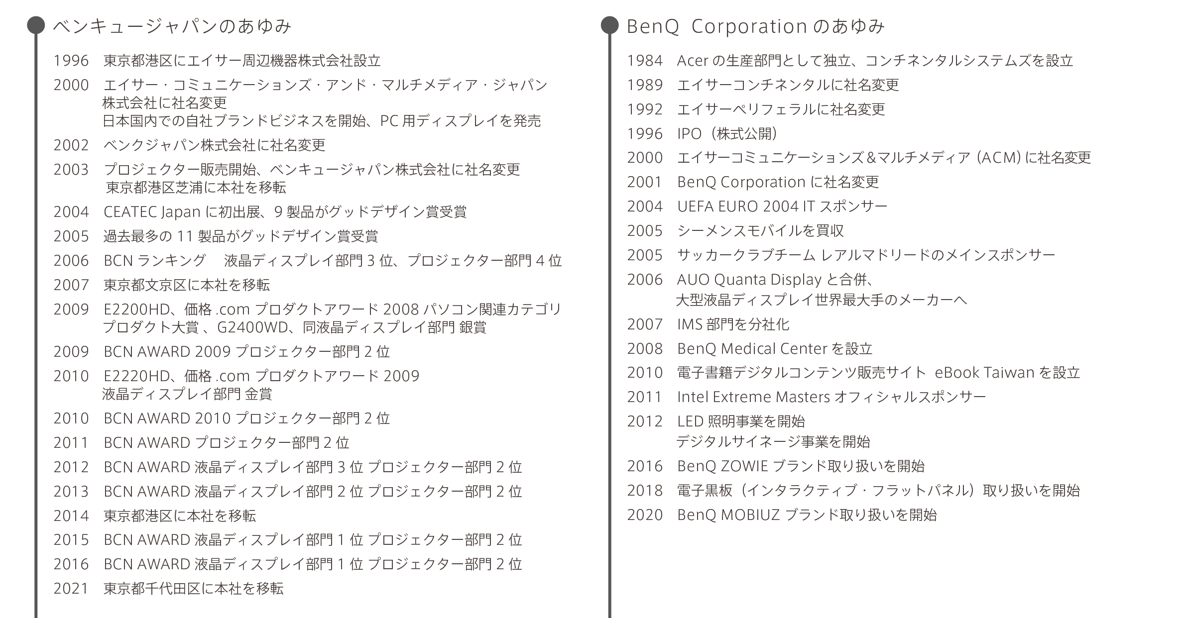 ベンキュージャパン株式会社は、1996年に日本におけるOEM/ODM先メーカー様に対する、ロジスティクスおよび修理サービス会社として設立されました。その後、2000年に自社ブランドでのビジネスを開始し、現在はプロジェクターと液晶ディスプレイの販売を軸に事業を展開しております。