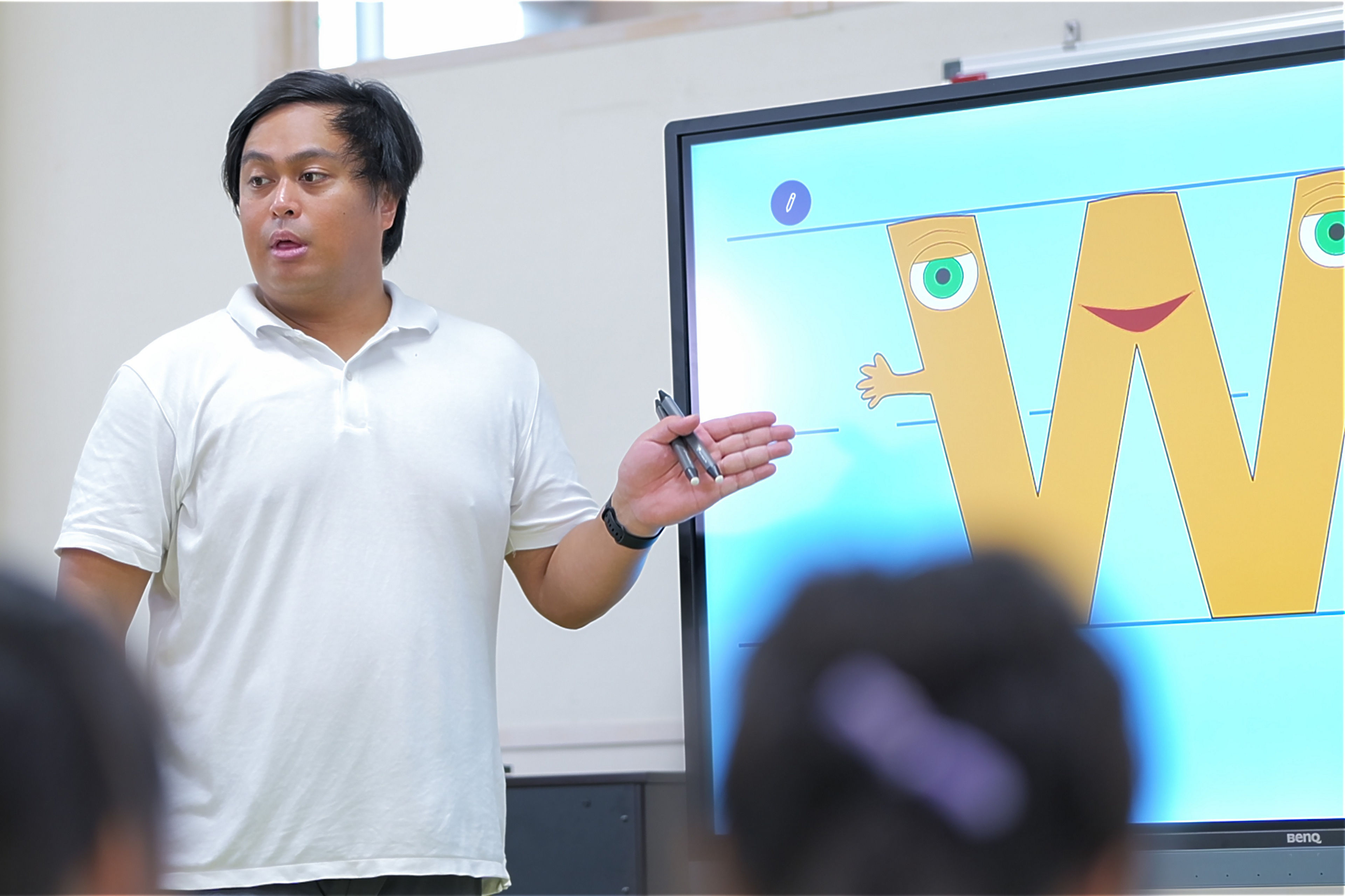 BenQ Boardの画面の大きさは、子供たちにとっても大きなメリット。今まで紙で見せていたものを大画面に映し出すだけでも子供たちの食いつきが全然違います。そして書き込みもできるので、参加型の授業も可能です。