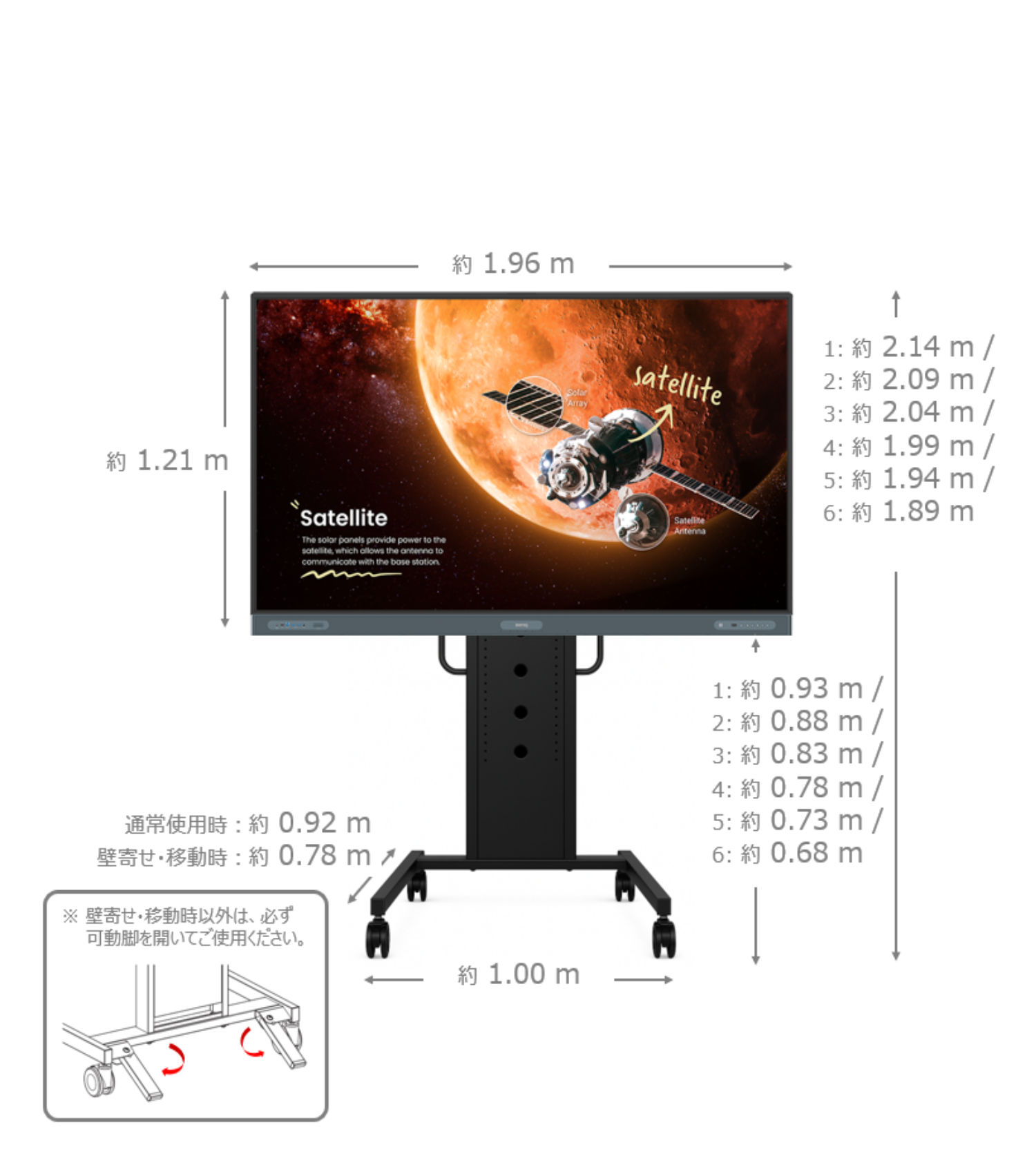• 支柱の高さが 約1.93m のため、液晶上部から一部はみ出る場合があります。