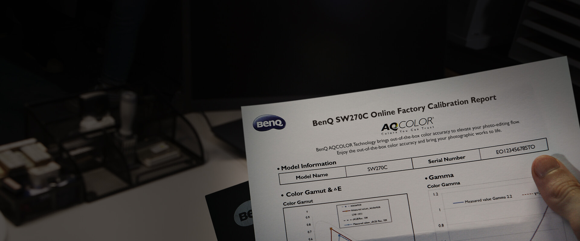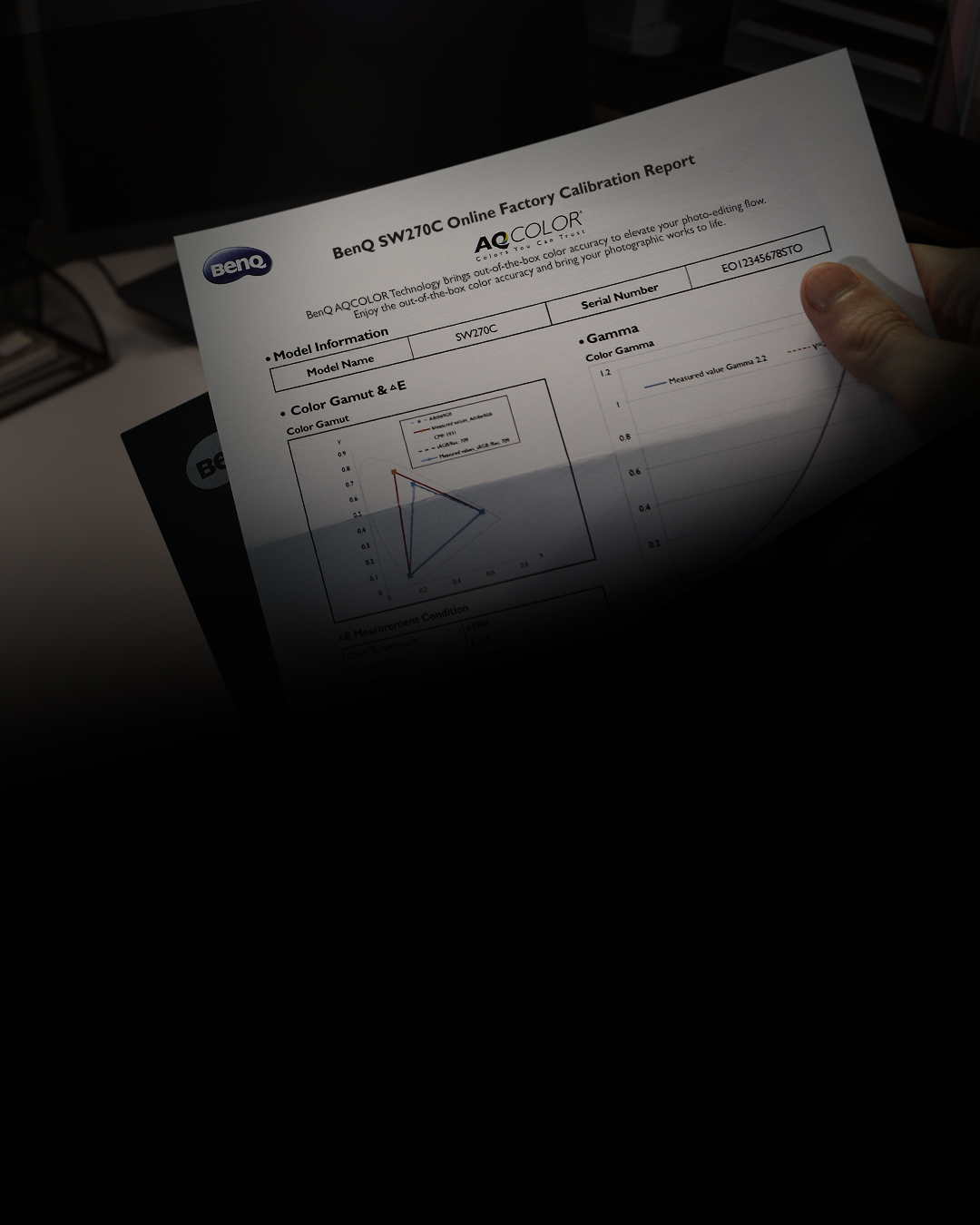 BenQの AQCOLOR シリーズモニターに同梱されている工場キャリブレーションレポートは、業界基準に準拠する厳格な発色試験に合格していることを保証するだけでなく、信頼できる色を備えたモニターを提供するためのBenQの努力の証しでもあります。