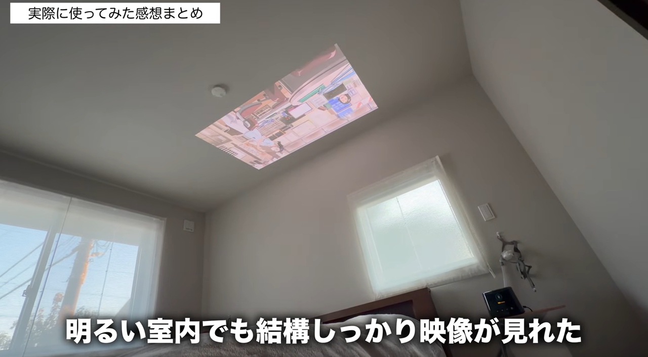 日本の住宅事情では、大きな壁があっても家具や窓、ドアで遮られていることが少なくありません。一方、天井は障害物が少なく、100インチ以上の巨大なスクリーンを確保しやすい空間です。
