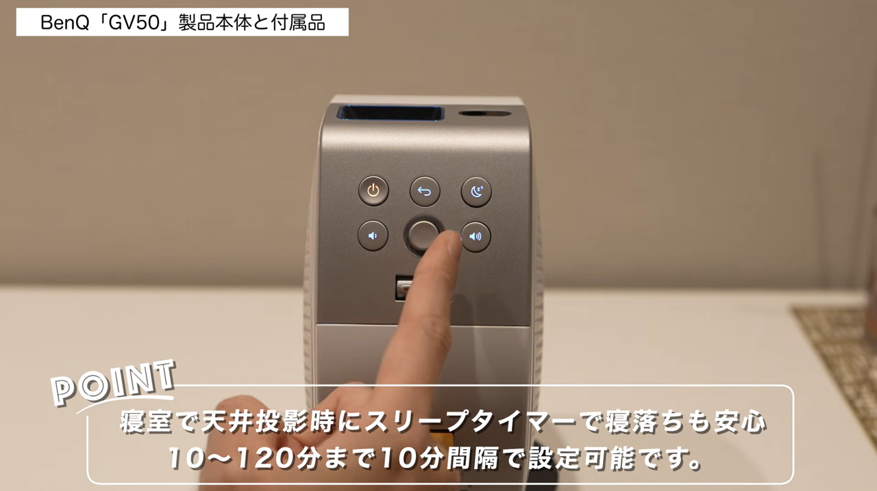 寝ながら視聴する場合、そのまま寝てしまうことも多いはず。天井プロジェクターにスリープタイマーや専用ボタンがあると、非常に便利です。
