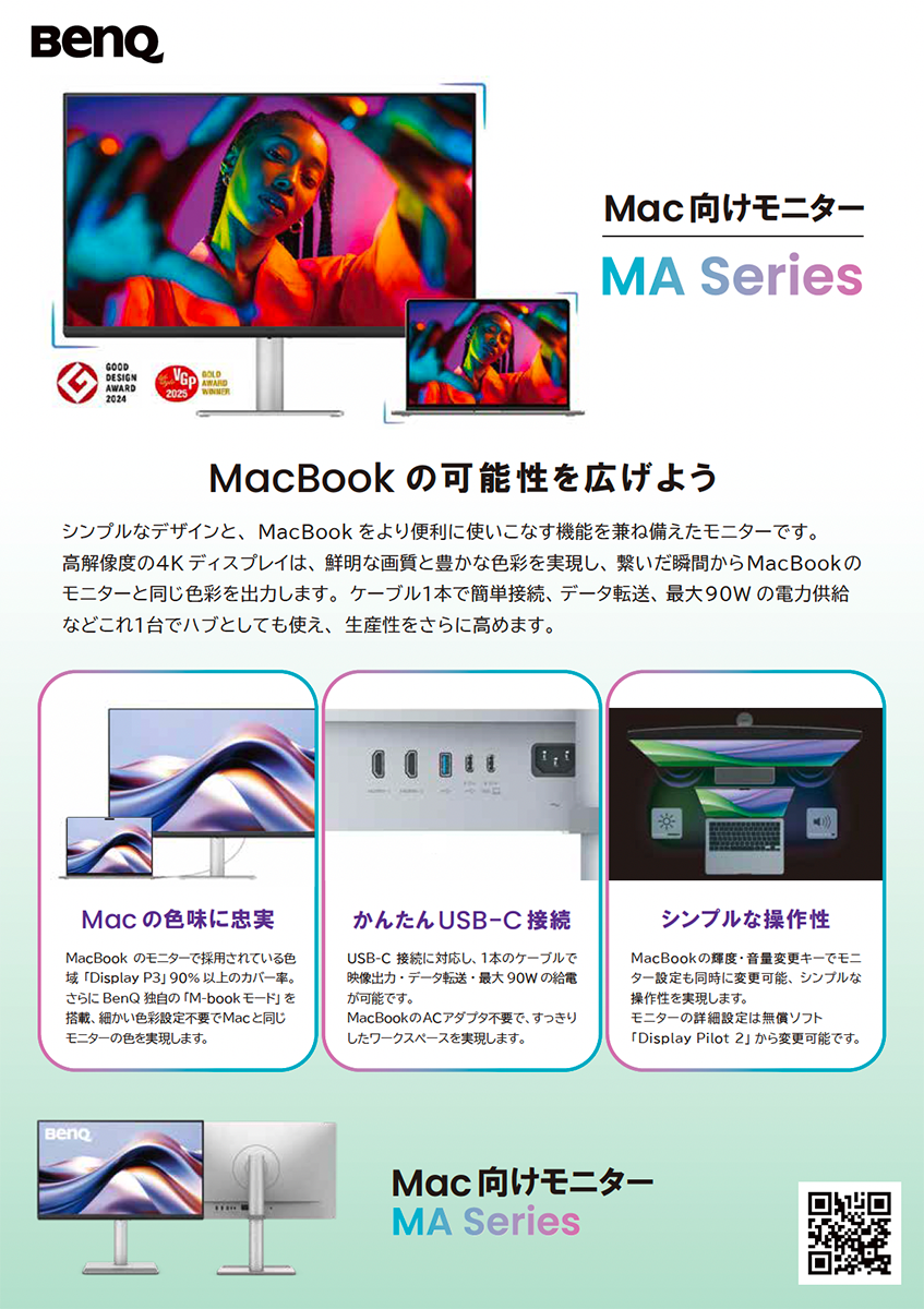 シンプルさこそが個性の表現につながると信じています。 MacBook ProやMacBook Airと接続するだけで一体化できるスタイリッシュな外付けモニターは、その1ステップ目となります。 新しいBenQ MAシリーズは、独自のMacカラーチューニング技術により、Macと一貫した色彩をお楽しみいただけます。 BenQ MAシリーズ Mac用4Kモニターで鮮やかなディスプレイ体験を楽しみください!
