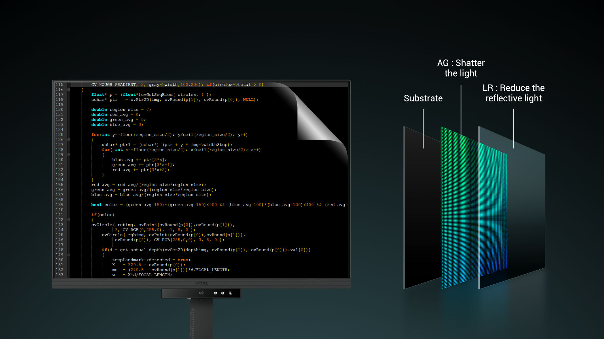 プログラマーのために作られたBenQプログラミングモニターは、画面反射を低減しコーディング作業に没頭できる環境を実現します。