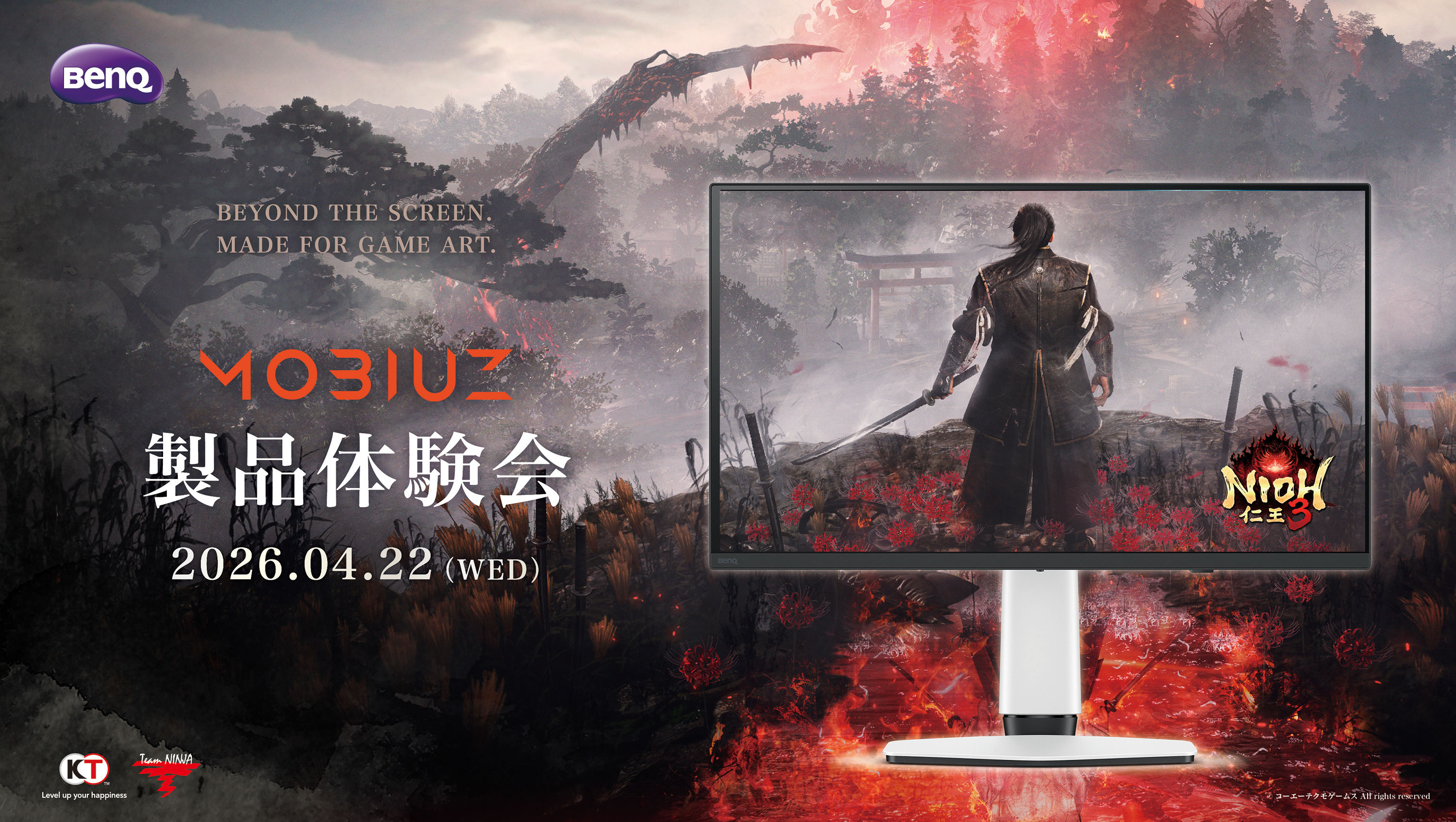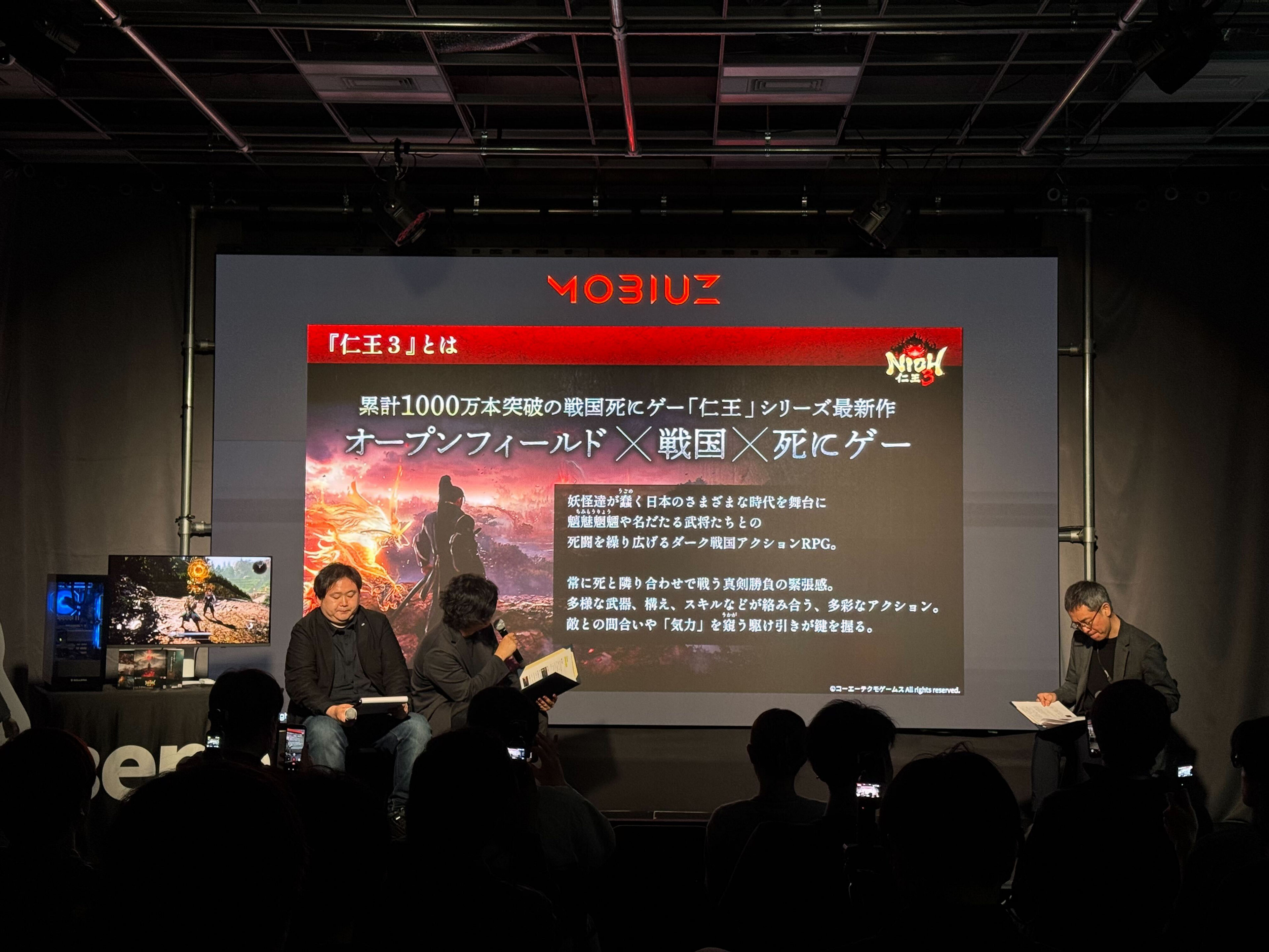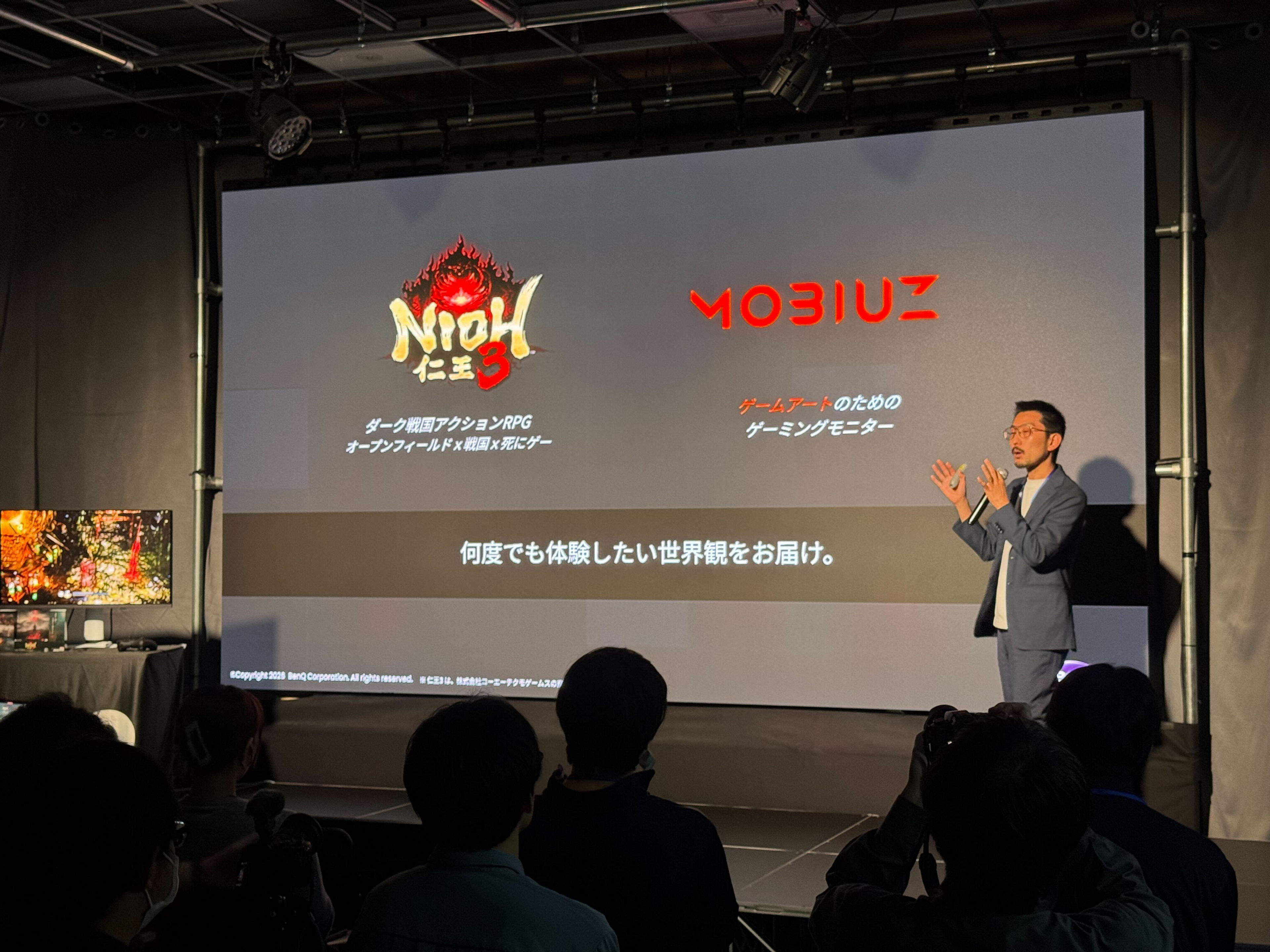 ゲーム体験においては解像度やフレームレートの高さが重視されがちな一方で、制作者はその世界観を表現するために色彩に徹底したこだわりを持って制作しています。こうした意図をどれだけ忠実に再現できるかという観点から、ゲーム体験への影響を体感いただく場として、「MOBIUZ有機ELモデル 製品体験会」を2026年4月22日(水)に都内にて開催しました。本製品体験会では、株式会社コーエーテクモゲームス(本社:神奈川県横浜市 代表取締役社長:鯉沼 久史)より発売されたダーク戦国アクションRPG『仁王3』のゼネラルプロデューサー 安田文彦氏、アートディレクター 田渕賢作氏をゲストに迎え、開発者視点での世界観表現やビジュアルデザインの考え方についてご紹介いただいたほか、MOBIUZの開発背景や差別化ポイントについても発信しました。