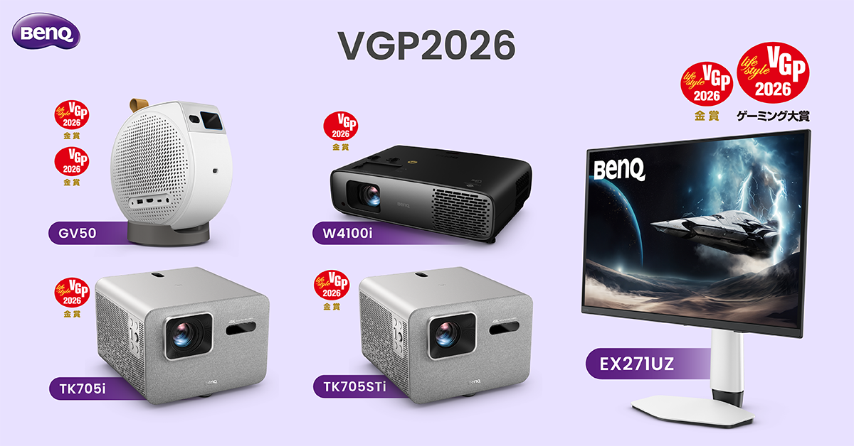 ベンキュージャパン株式会社(本社:東京都千代田区、以下:BenQ)は、株式会社音元出版(所在地:東京都千代田区、代表取締役社長:風間 雄介)が主催する、プロの視点で優れたオーディオビジュアル機器を選定するアワード「VGP2026」にて、4K QD-OLEDゲーミングモニター 『EX271UZ』 が特別賞「ゲーミング大賞」を受賞しました。各部門別でも『W4100i』『GV50』『TK705STi』『TK705i』『EX271UZ』が金賞を受賞し、専門家より高い評価を獲得しました。