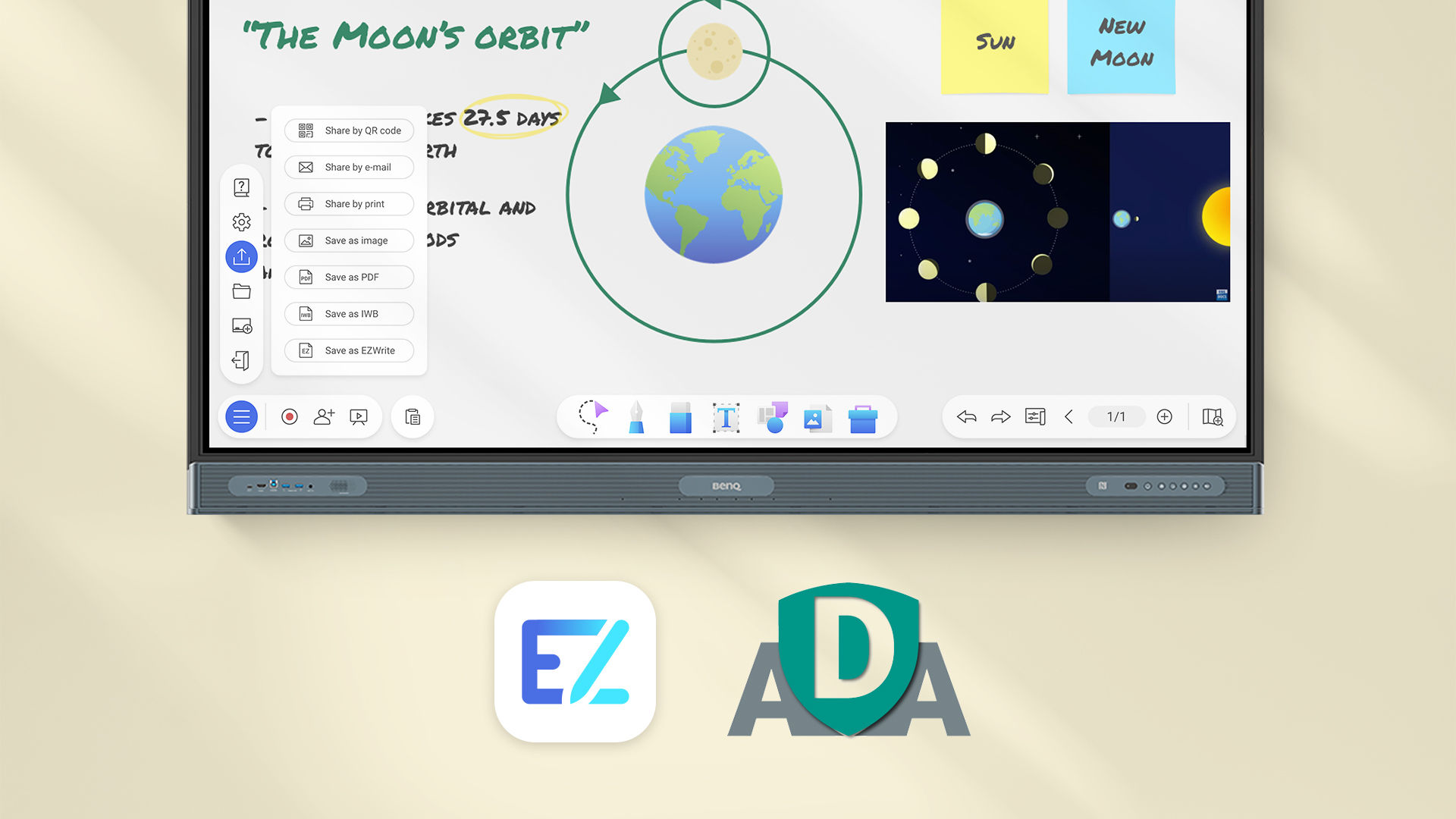 EZWrite는 사용자가 클라우드 저장소에 쉽게 액세스하여 문서, 슬라이드, 이미지 등 기존 자료를 가져오고 편집할 수 있도록 하여 수업을 간소화하는 대화형 화이트보드입니다. AI 기반 필기 및 도형 인식, 광학 문자 인식, 번역 등 대화형 수업을 위한 다양한 수업 도구가 포함되어 있습니다. 최신 BenQ 보드에 사전 설치되어 제공되며 Windows, macOS, iPadOS, ChromeOS 및 웹에서도 사용할 수 있습니다.