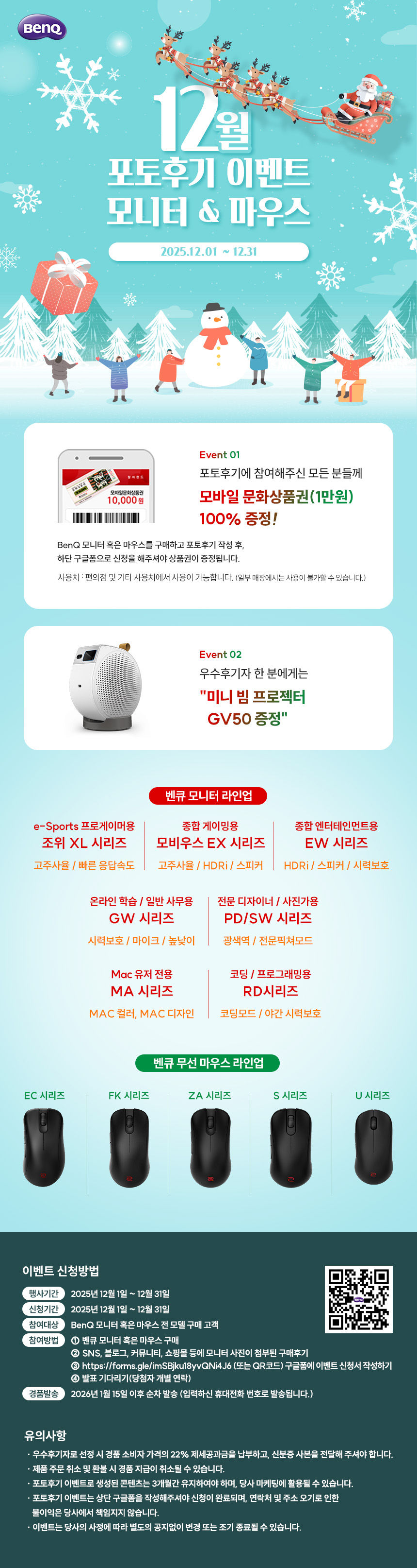 벤큐 모니터&마우스 구매 후 포토후기를 남겨주세요! 남기신 포토후기의 링크와 함께 구글폼으로 신청해주신 모든 분들에게 컬쳐랜드 상품권 1만원권을 증정합니다.