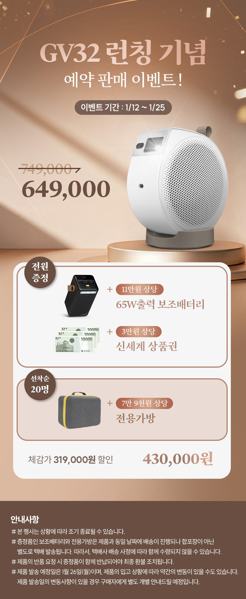 GV32에 내장된 2.1채널 18W 스피커 시스템은 전용 베이스를 포함해 영화 감상에 어울리는 풍부한 사운드를 제공합니다. 별도의 스피커 없이도, 공간을 가득 채우는 소리를 경험해보세요.
